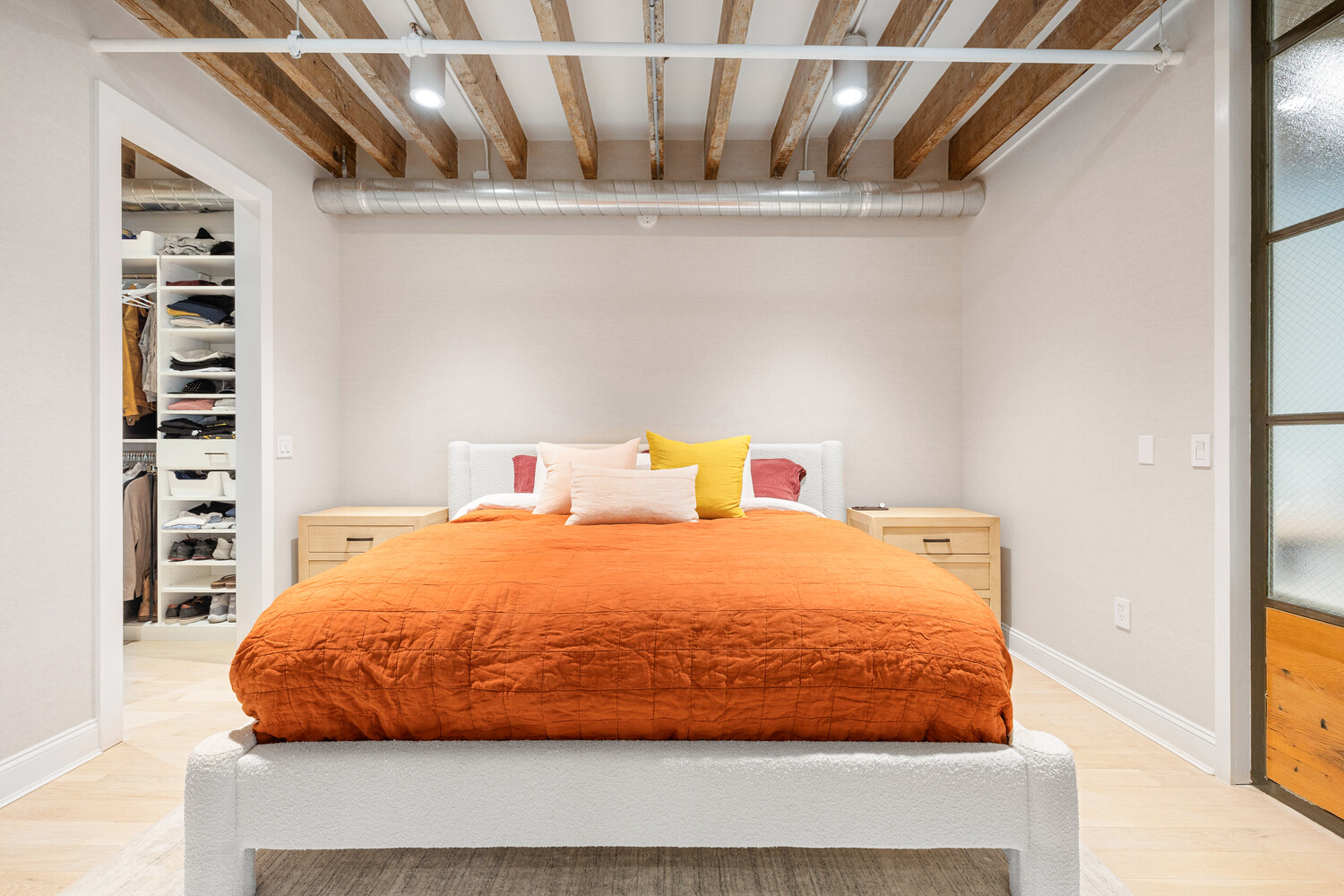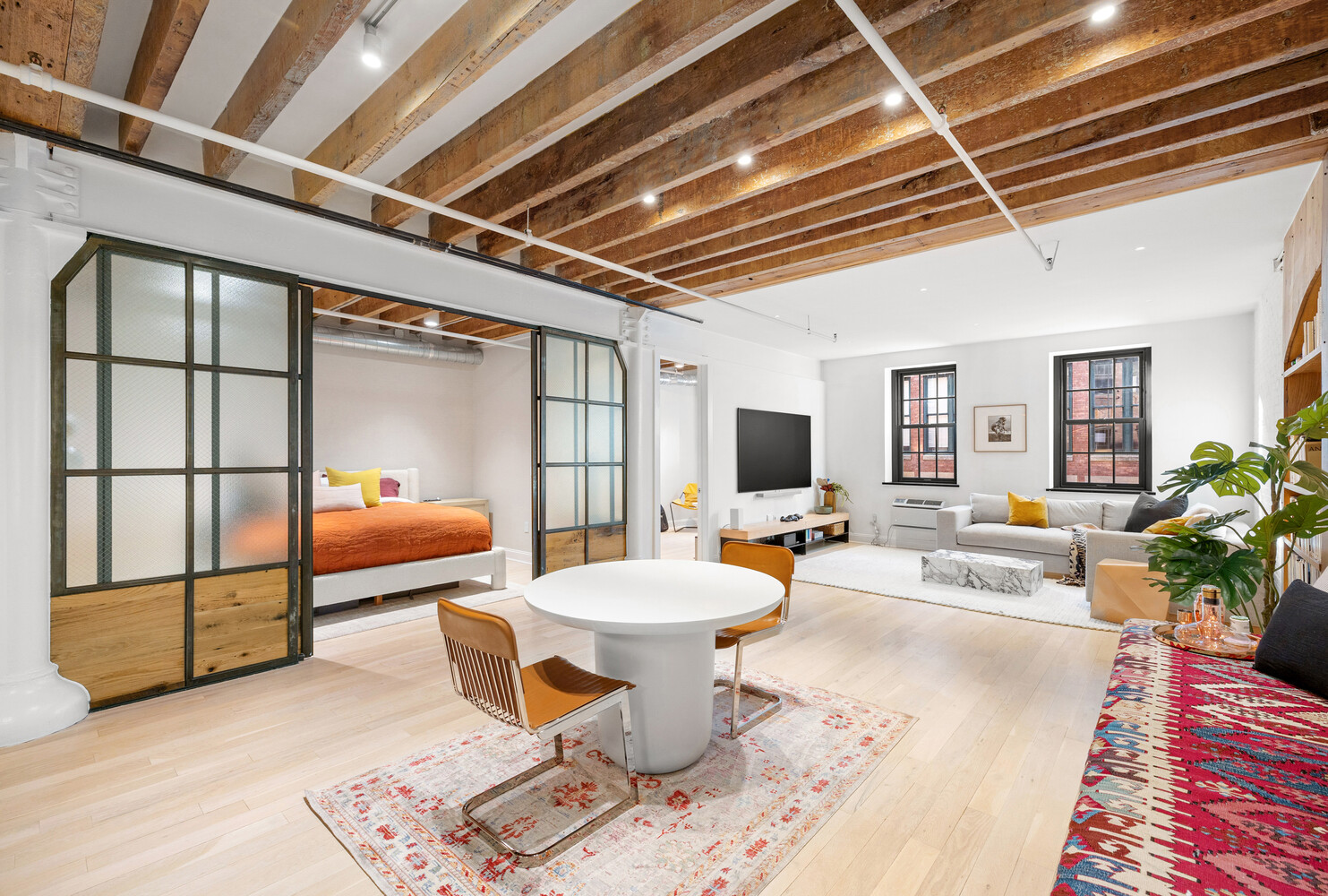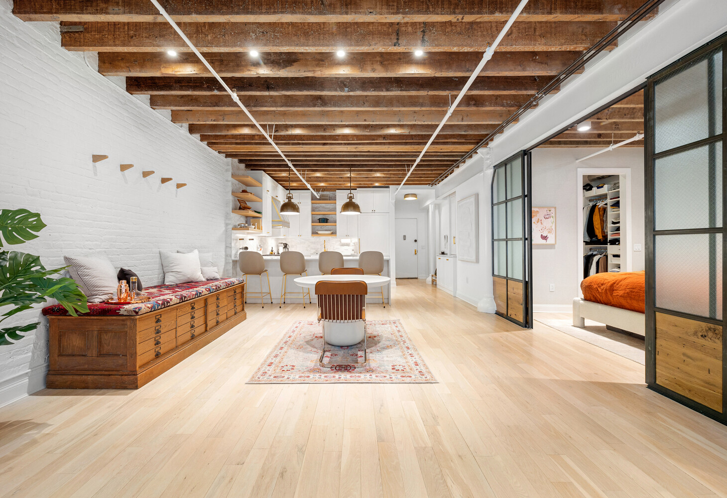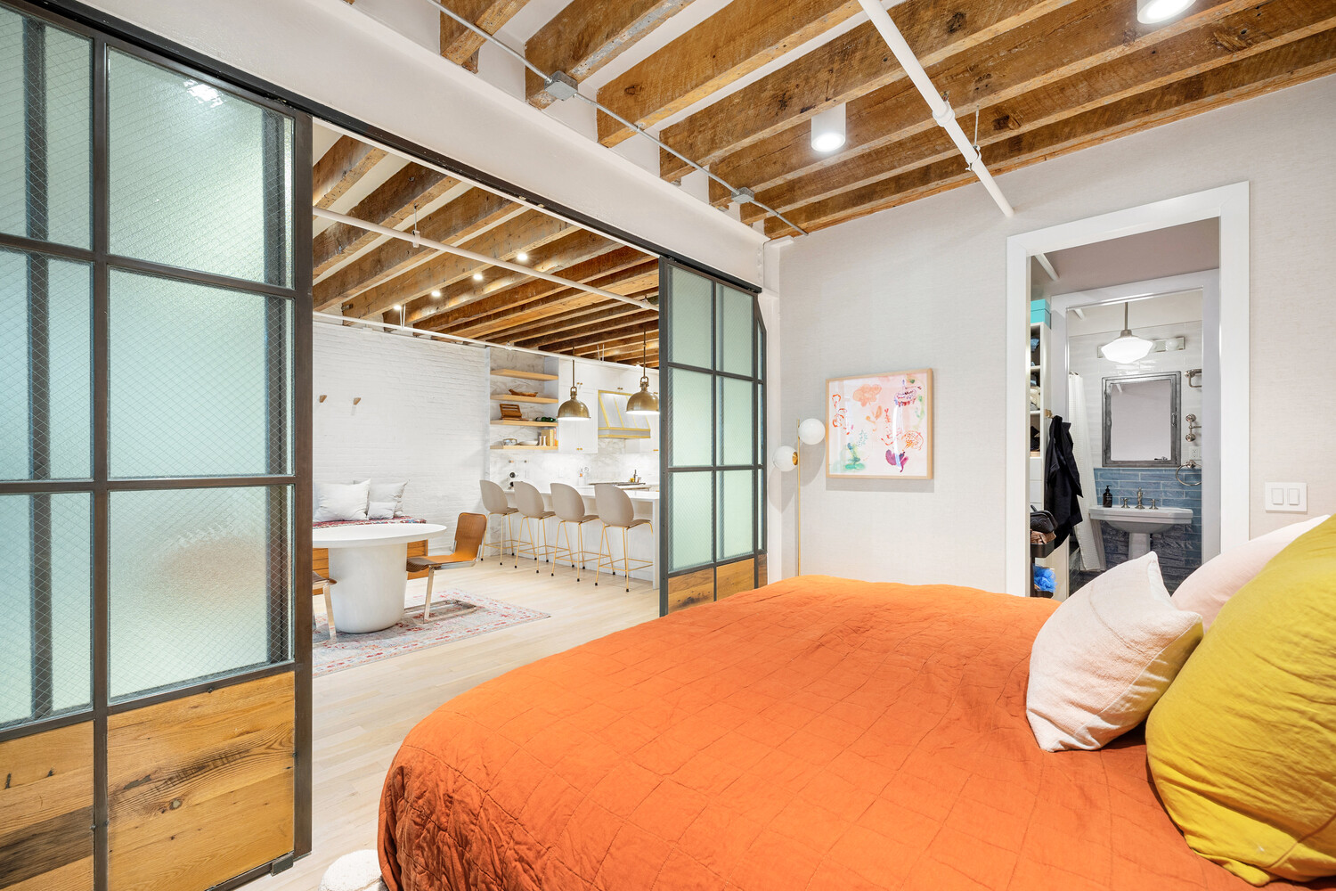 The primary bedroom features a custom steel-and-glass sliding wall crafted by Dumbo's own Mark Jupiter, along with a newly installed bathroom that includes a deep soaking tub, radiant heated floors, and a large walk-in closet.