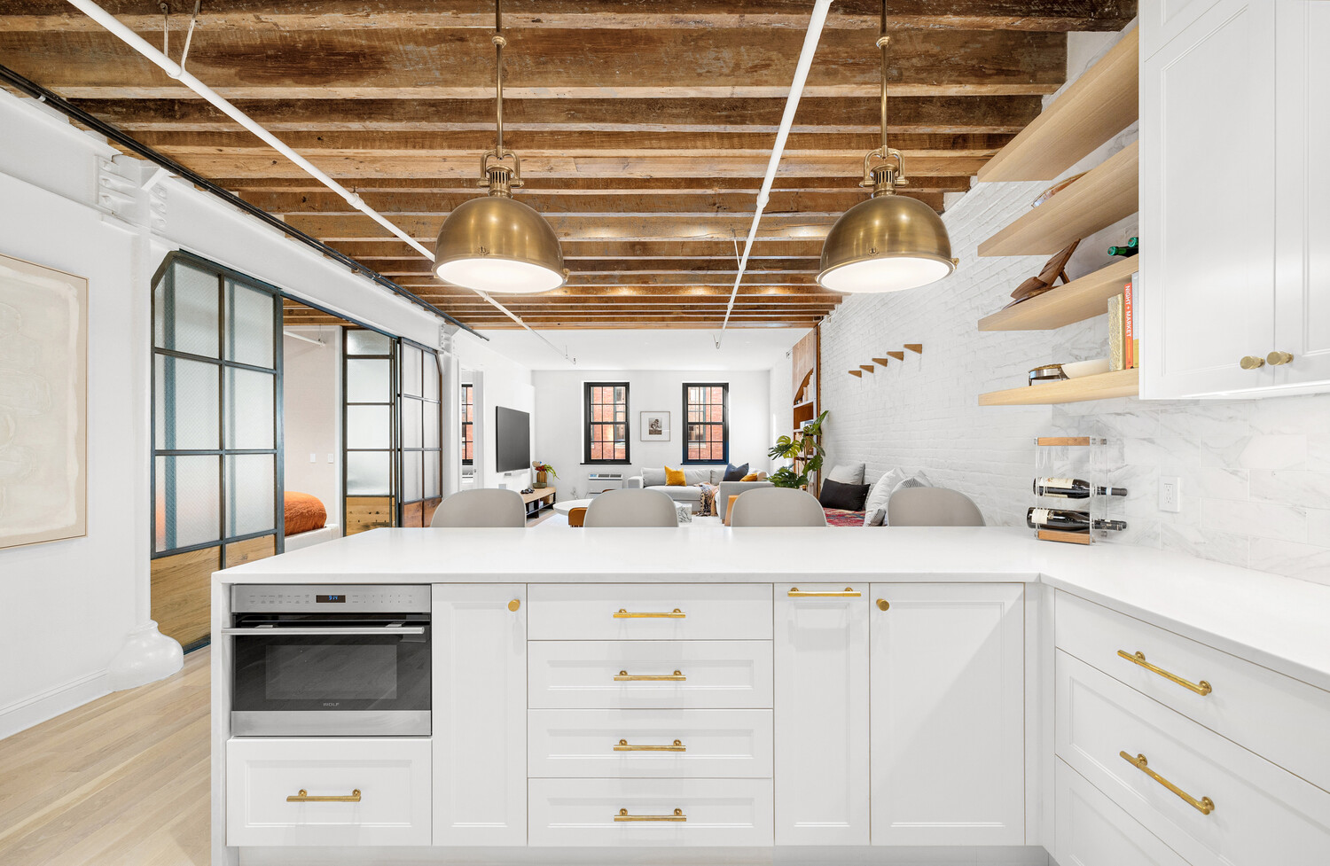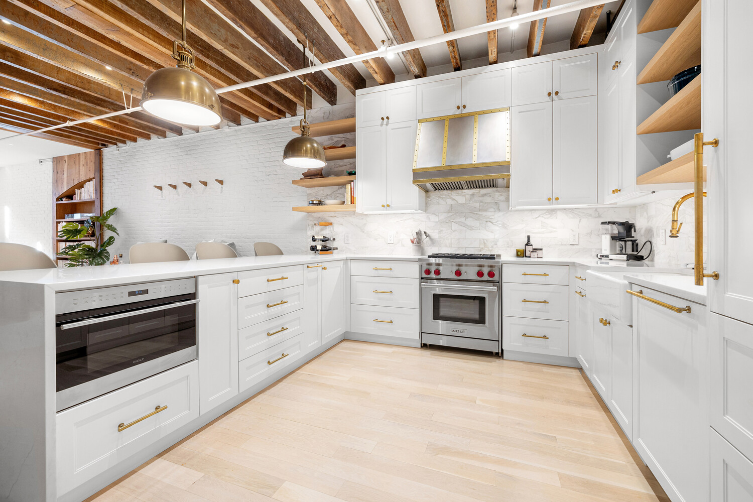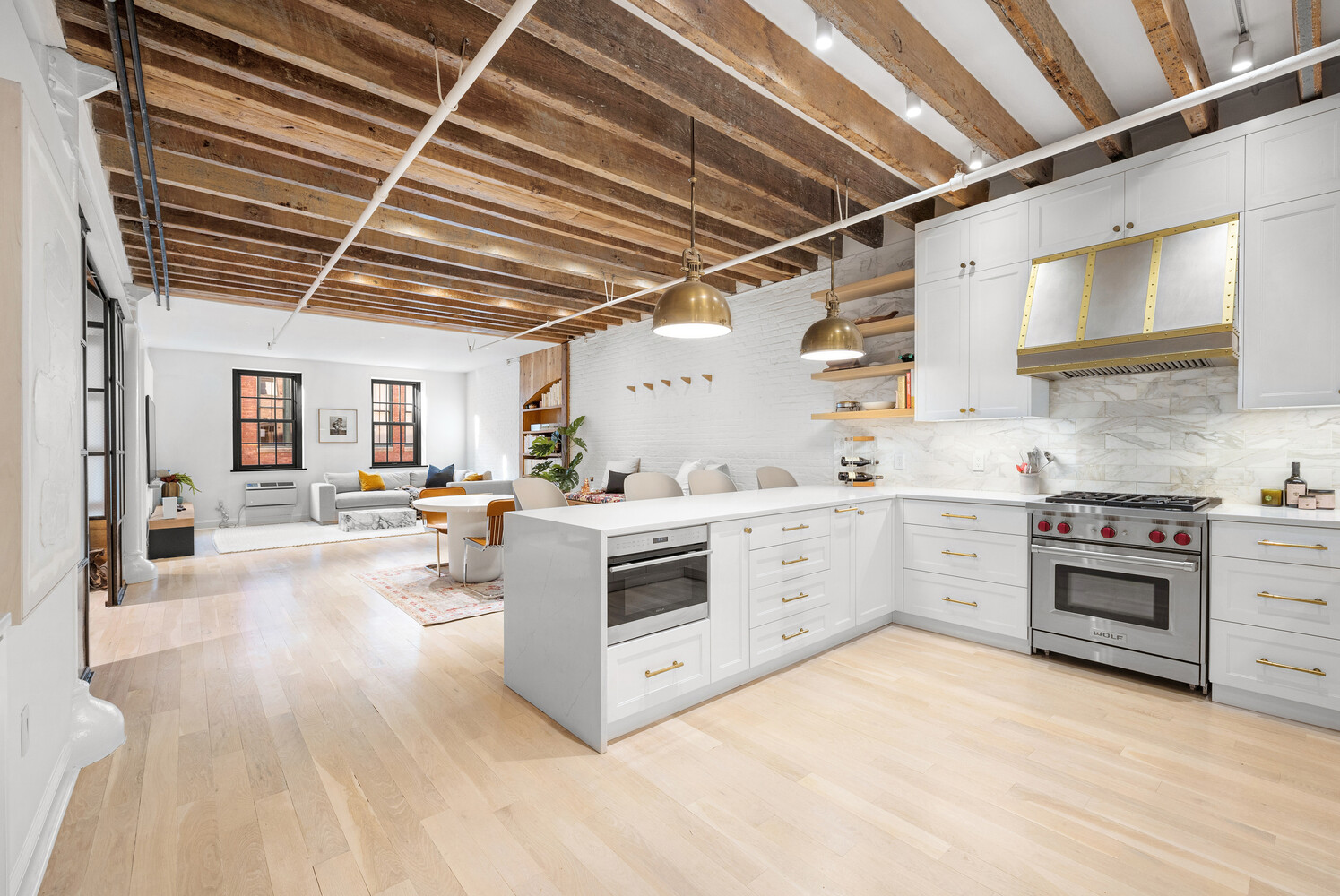 Configured as a two-bedroom, two-bathroom home, the apartment offers a chef's kitchen complete with custom cabinetry, a Wolf range, and a large Sub-Zero refrigerator. The kitchen island, with ample storage, is beautifully illuminated by pendant lighting and complemented by light maple shelves and a marble backsplash. The thoughtfully installed recessed lighting enhances the space without losing its industrial feel.