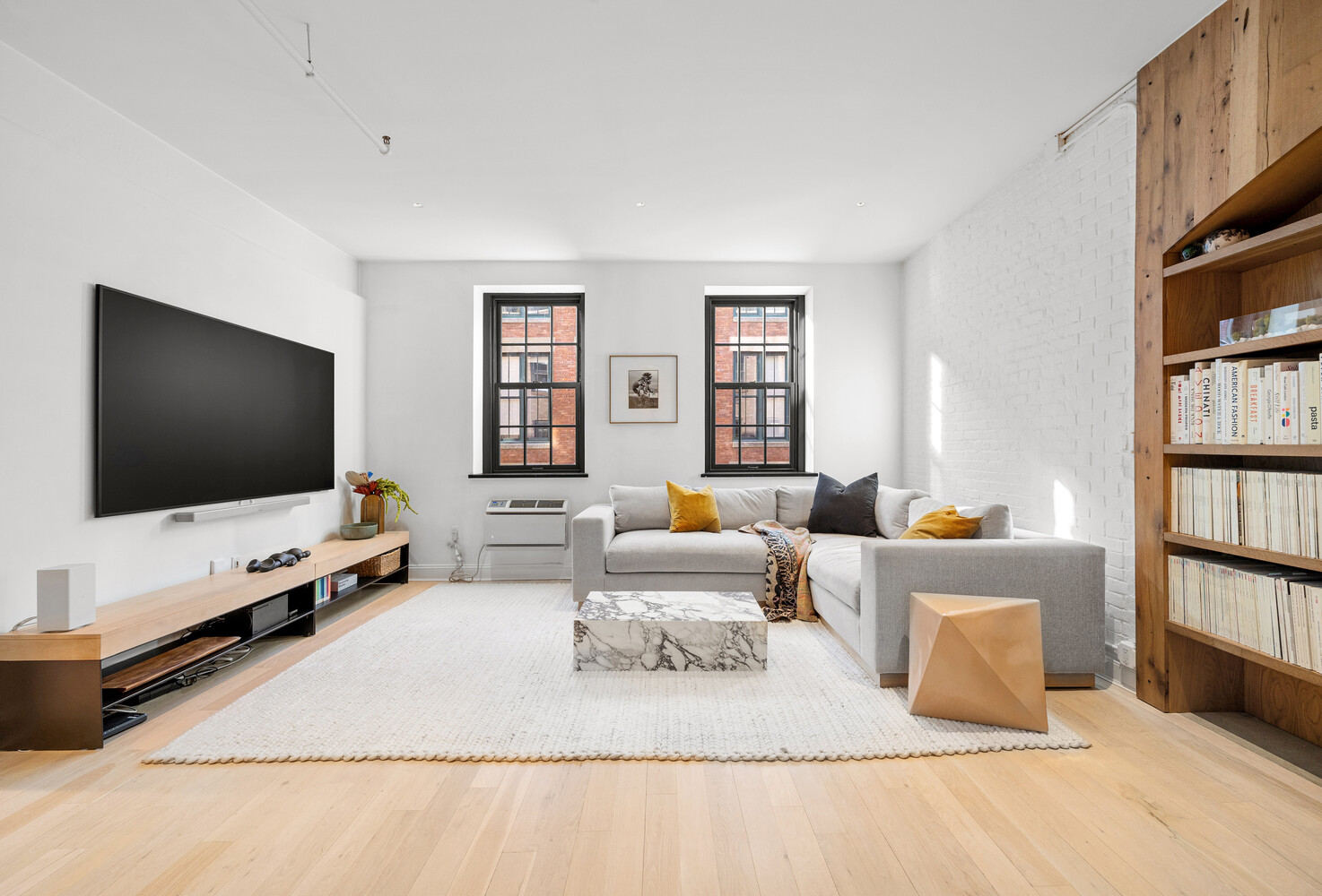 The living room offers an open, well-designed layout that makes it ideal for hosting friends or family, or for cozying up to watch a movie. The space seamlessly combines comfort and style, making it perfect for entertaining or relaxing. The exposed brick wall in the living room is adorned with custom-built shelving, expertly crafted by the renowned Mark Jupiter. The extensive soundproofing throughout the apartment ensures a serene and quiet living experience.