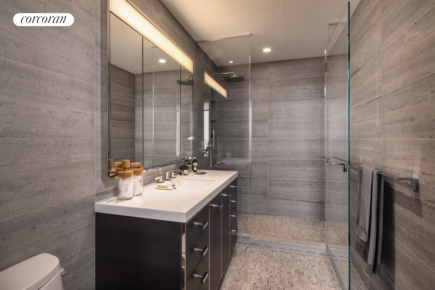 Residence 27L is a 1,123 square foot two bedroom, two bathroom with an open gourmet kitchen and breakfast bar. This spacious residence faces North East and North West, with expansive City and East River views. Warm, modern interiors are brought to life by the renowned design team at Meyer Davis Studio. This residence features imported stone and custom finishes, premium Miele appliance package, 5" wide stained oak flooring, master bath with custom wood cabinetry, marble tile walls and mosaic floors with radiant heat, under-mount Wetstyle sink with glass vanity top and Dornbracht polished chrome faucets and a washer and dryer.
