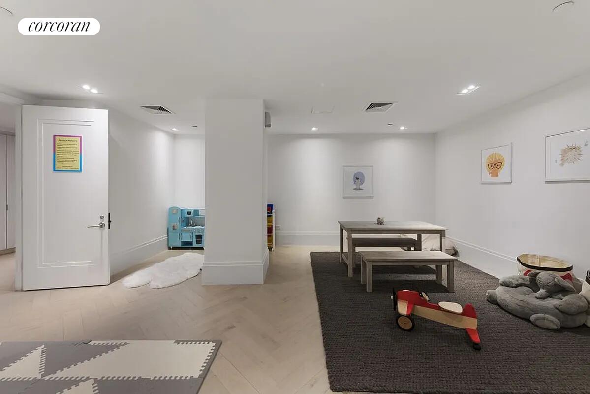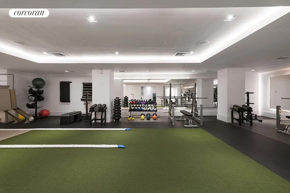 Modern Interiors, lobby with 24/7 Doorman, and full amenities package including fitness studio, resident lounge, and children's playroom, sauna, a golf simulator, and a landscaped rooftop terrace complete with a gas grill and comfortable outdoor seating..