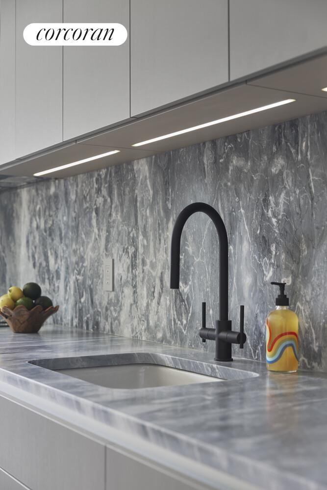 Residence 606 is a spacious 947sf split two-bedroom, two-and-a-half-bath home with north-facing city views. The open-concept kitchen is outfitted with marble countertops and backsplashes, custom cabinetry offering ample storage, and premium appliances by Miele and Bosch.