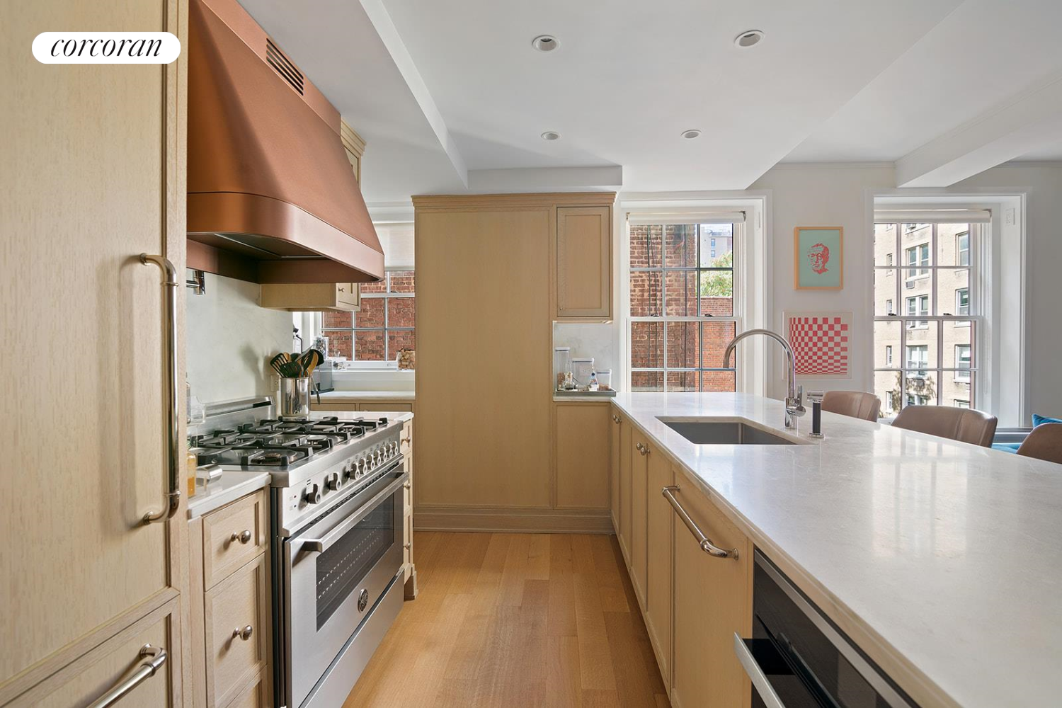 The Chef's Open Kitchen has stunning Calacatta Caldia marble counters and backsplash and features high-end Miele appliances, including dishwasher, convection microwave oven, Bertazzoni stove with custom-made pot filler faucet and plenty of storage space in the custom cabinetry and pantry.