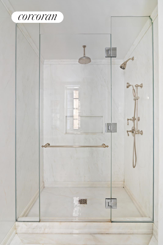 The primary bedroom features a luxurious en-suite bathroom with radiant custom mosaic heated floor, dual sinks, Waterworks fixtures, custom cabinetry, oversized double head shower and two oversized windows.