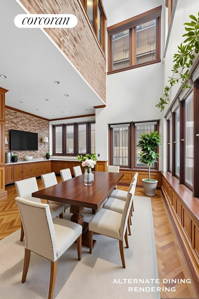 A Carrara marble vestibule leads into a center hall with 15-foot ceilings. The 500-square-foot primary parlor features inlaid mahogany floors, crown moldings, and the first of eleven fireplaces. French doors in the reception room open to 71st Street. The original mahogany-and-bronze elevator connects nearly every level of the house. The Drawing Rooma dramatic double-height room offers 20-foot vaulted ceilings, original herringbone parquet floors, and abundant natural light. A discreet service kitchen provides convenience for casual dining, coffee, or cocktails, with flexibility for a full kitchen redesign.