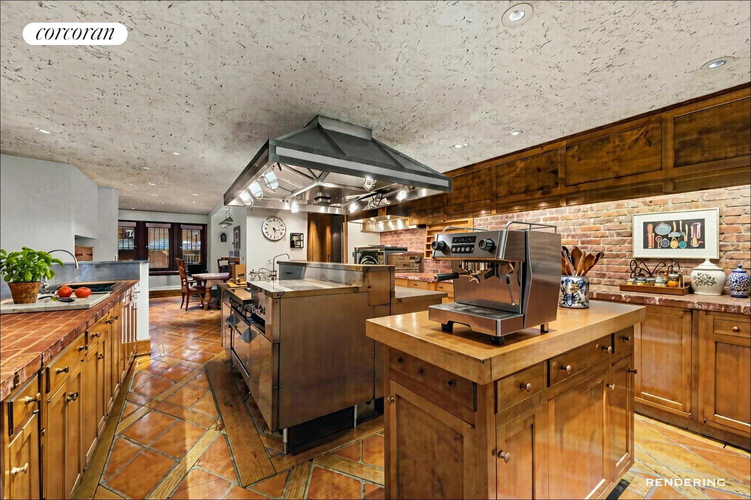 One Floor below is the home's formal dining room able to comfortably seat thirty. The adjoining kitchen, designed by Swiss craftsman André Liardet during the home's conversion from the Lycée School, features terra cotta tile, wainscoting, beveled glass, and more than 30 feet of cabinetry and counter space. A double-sided restaurant-grade stove with rotisserie oven and additional refrigeration makes this a kitchen equally suited for family meals or large-scale entertaining.