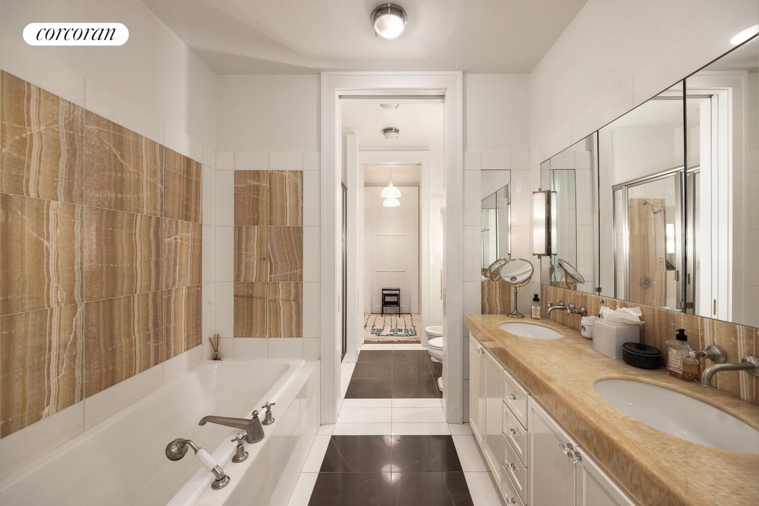 The second floor is designed as a full-floor primary suite, offering a large south-facing bedroom with fireplace and adjacent sitting room or study. The en-suite bath features dual vanities, soaking tub, and separate shower, while multiple walk-in closets and a dressing areas offering ample storage.