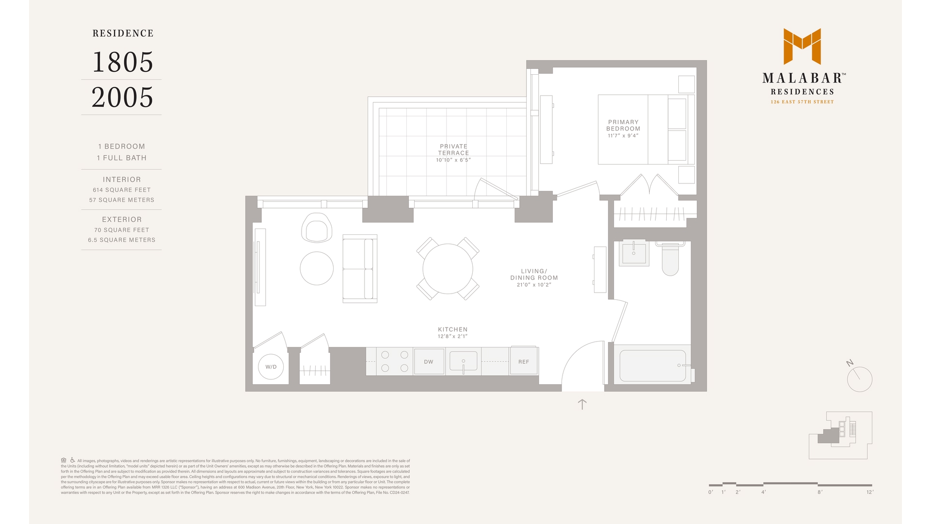Residence 1805 is a 614-square-foot one-bedroom home, enhanced by a 70-square-foot private loggia and northwestern exposures. Soaring 10'6" ceilings and 8-foot windows and clean architectural lines lend the home a sense of openness and quiet sophistication.