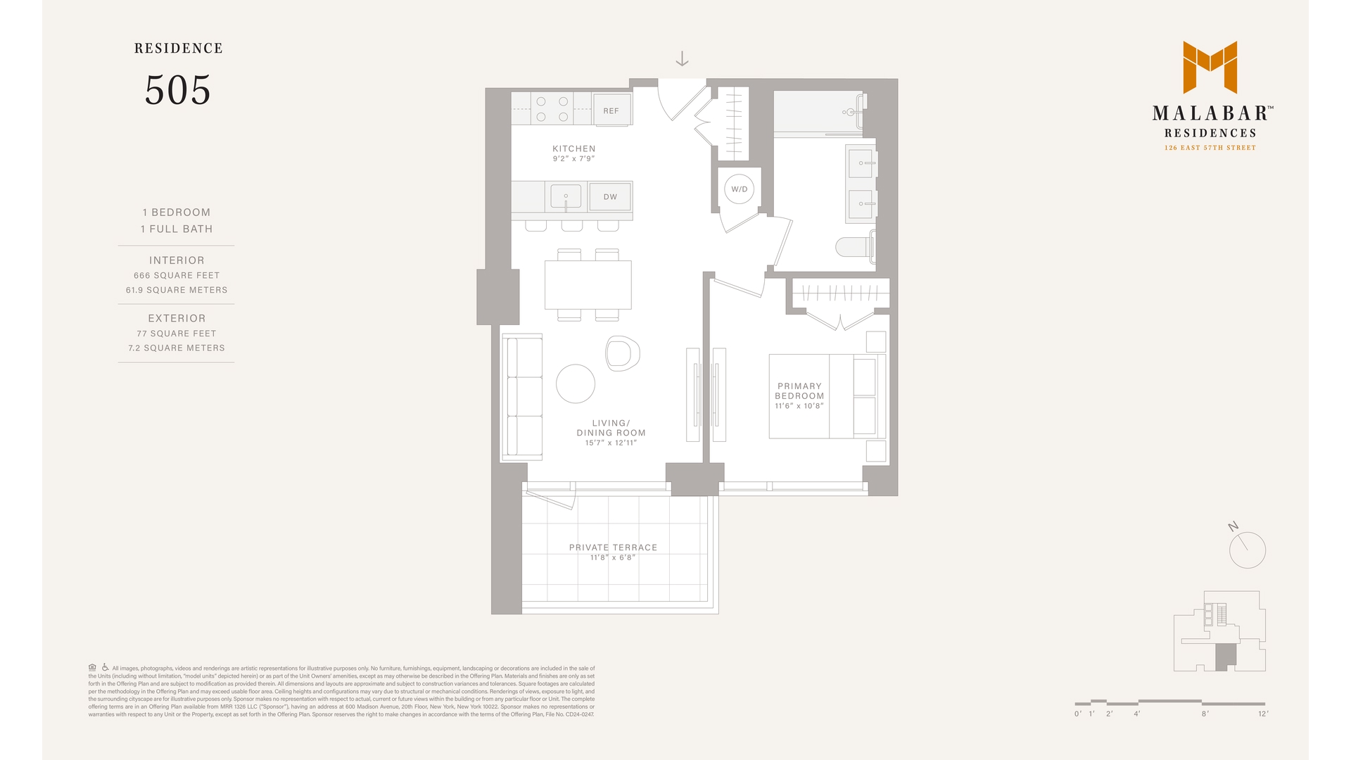 Residence 505 is a thoughtfully composed 666-square-foot one-bedroom, one-bath residence with a 77-square-foot private terrace and southern exposures. The layout is defined by over 10-foot ceilings with 8-foot windows, creating a clear sense of spatial clarity.
