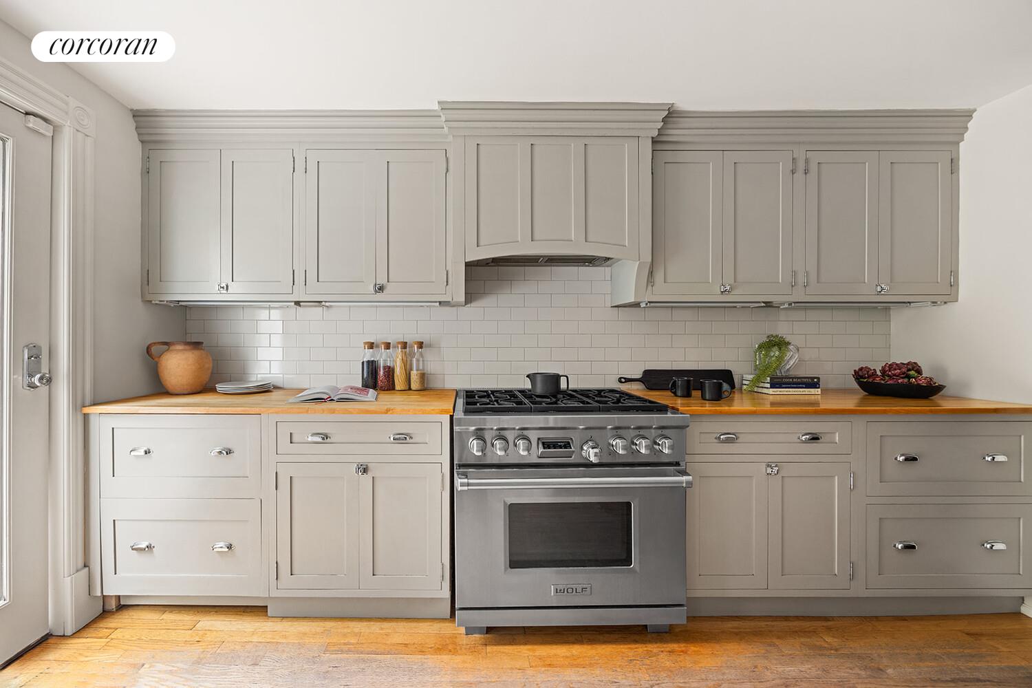 Gracefully laid out over three stories plus a semi-finished basement, this brick beauty sits on a 17' x 100' lot and is ready to welcome its next owner. The garden level features a spacious living and dining area that opens up to a beautiful full-sized kitchen. Make all of your cooking dreams come true with a Wolf six-burner stove, Viking fridge and rare double ceramic sink. Entertaining will be a breeze as you can access the charming English backyard directly from the kitchen. This level also features a full bathroom as well as a vented washer/dryer with built-in cabinets and thoughtful storage throughout the space.