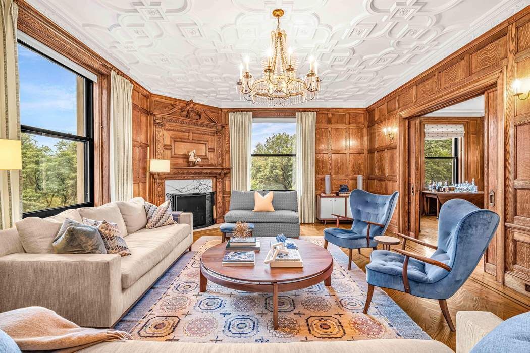Residence 4C is a rare offering: an expansive, 3,536-square-foot home filled with beautifully preserved and restored original details. These include ornate coffered ceilings, decorative plasterwork, intricate moldings, solid wood pocket doors, inlaid hardwood floors, and original wood-paneled living and dining rooms—each with a decorative fireplace. Oversized west-facing windows frame breathtaking views of Riverside Park and the Hudson River.