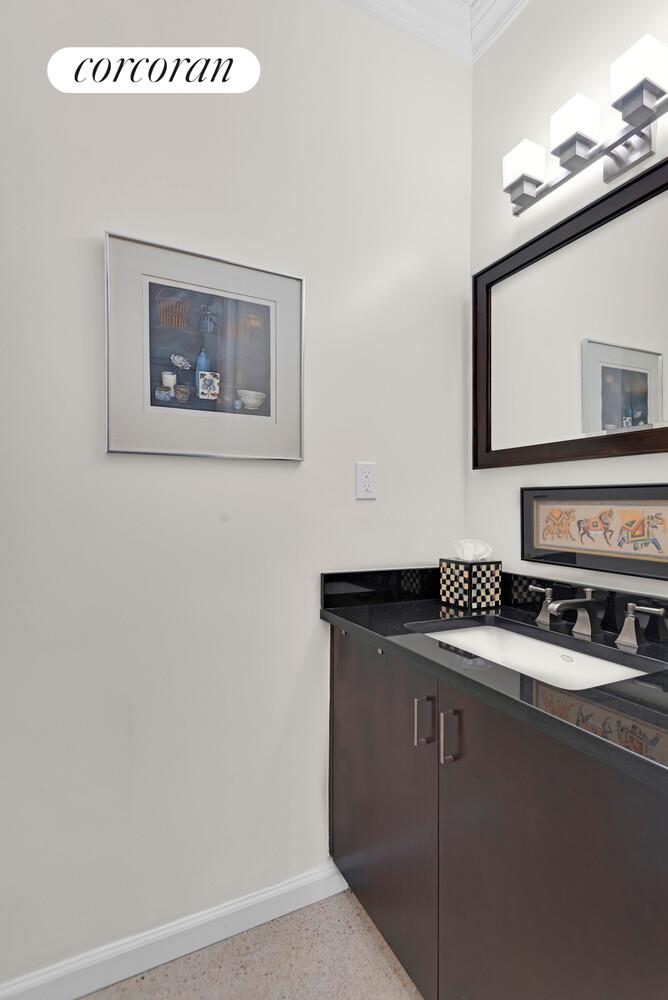 A 21-foot open concept living room has plenty of space for a dining area and/or home office. The fully outfitted kitchen is open to the living room and features a breakfast bar for casual dining and entertaining. There is plenty of cabinet and pantry storage, granite counters, and stainless appliances including a dishwasher and built-in microwave. Beautifully appointed, the apartment features wood floors and pretty crown moldings. Both baths are in excellent condition, and the powder room allows for privacy in entertaining.