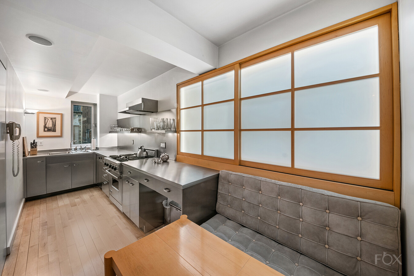 The stainless steel, windowed eat-in kitchen features top-of-the-line appliances and built-in banquette seating for four, perfect for casual dining. Off the generous central gallery, the primary suite offers a peaceful retreat, complete with a marble-clad en-suite bath, large windowed office or dressing area, and an enormous cedar-lined walk-in closet. An adjacent custom-designed dressing room (or library) includes built-in closets, a dresser, and specialized storage for garments, shoes, and accessories.