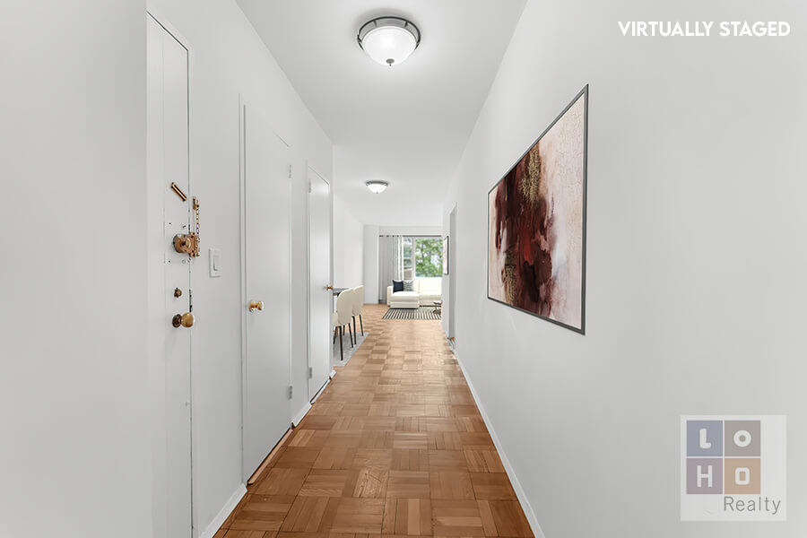 A long foyer, which houses three of the apartment's six generous closets, elegantly separates the living area from the windowed bath and two spacious bedrooms. The master bedroom is a true retreat, featuring two oversized walk-in closets and ample space to accommodate a king-sized bed, dressers, and more!