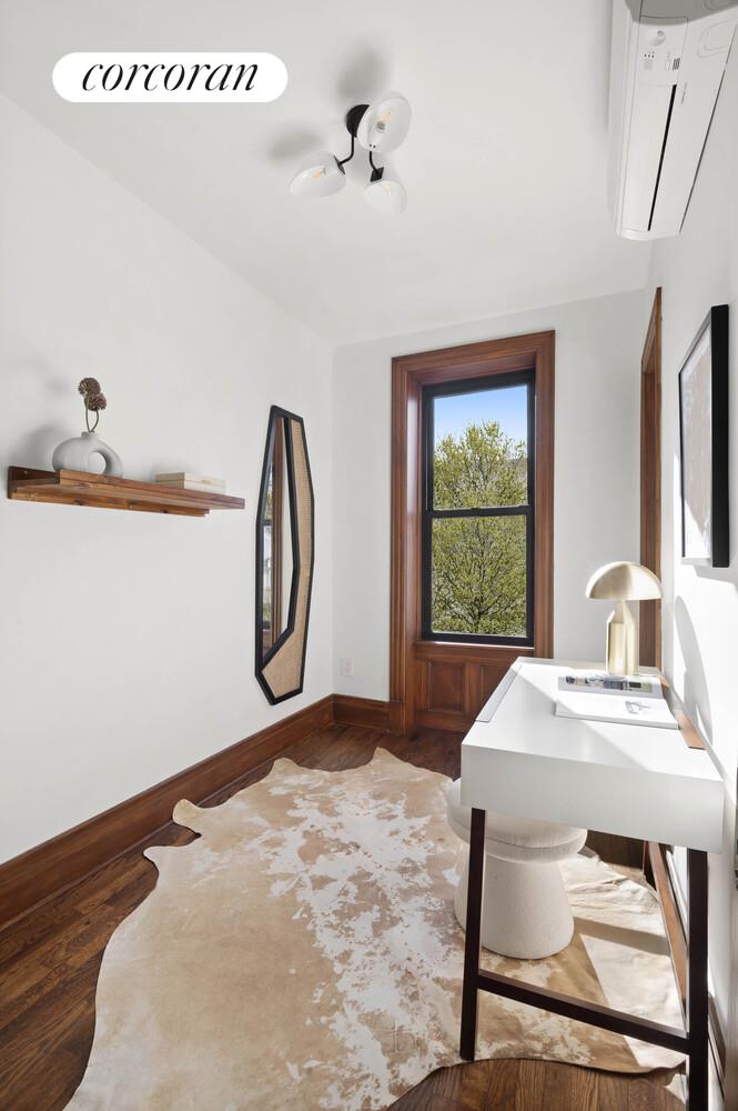 On the garden level, a beautifully restored and gut-renovated unit can be rented out for additional income. It includes 2 bedrooms and 1 bathroom, plus a home office/multi-purpose space. Original details include a decorative fireplace and gorgeous paneled woodwork.