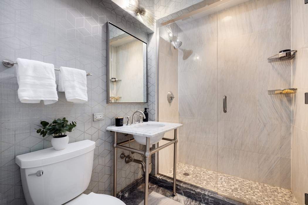 The expansive living and dining room offers a dramatic backdrop for both formal entertaining and relaxed daily living, enhanced by a wall of oversized windows overlooking the tranquil private gardens and terraces of neighboring townhouses. Just beyond, a set of French doors leads to a sophisticated den/home office/bedroom, a perfectly appointed extension of the living space.