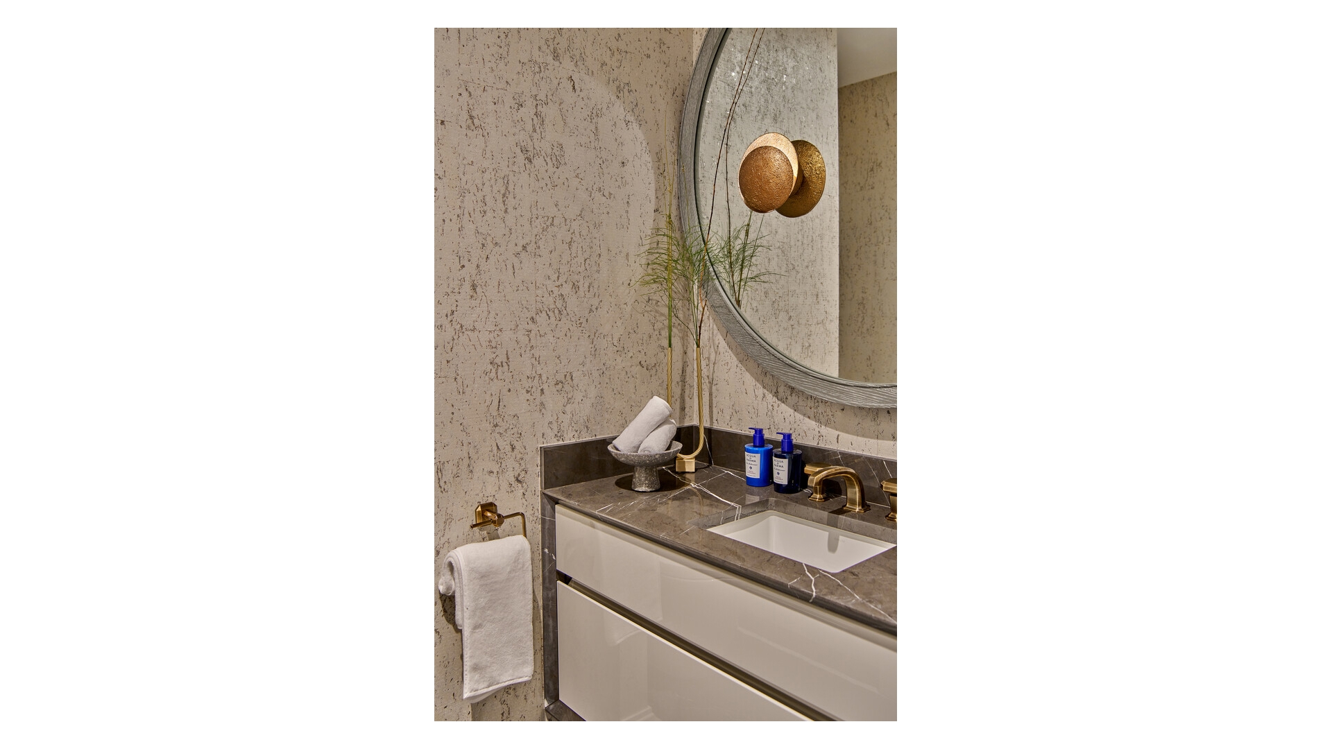 The powder room, located discreetly off the foyer, features a wall-mounted marble vanity and antique bronze fixtures.