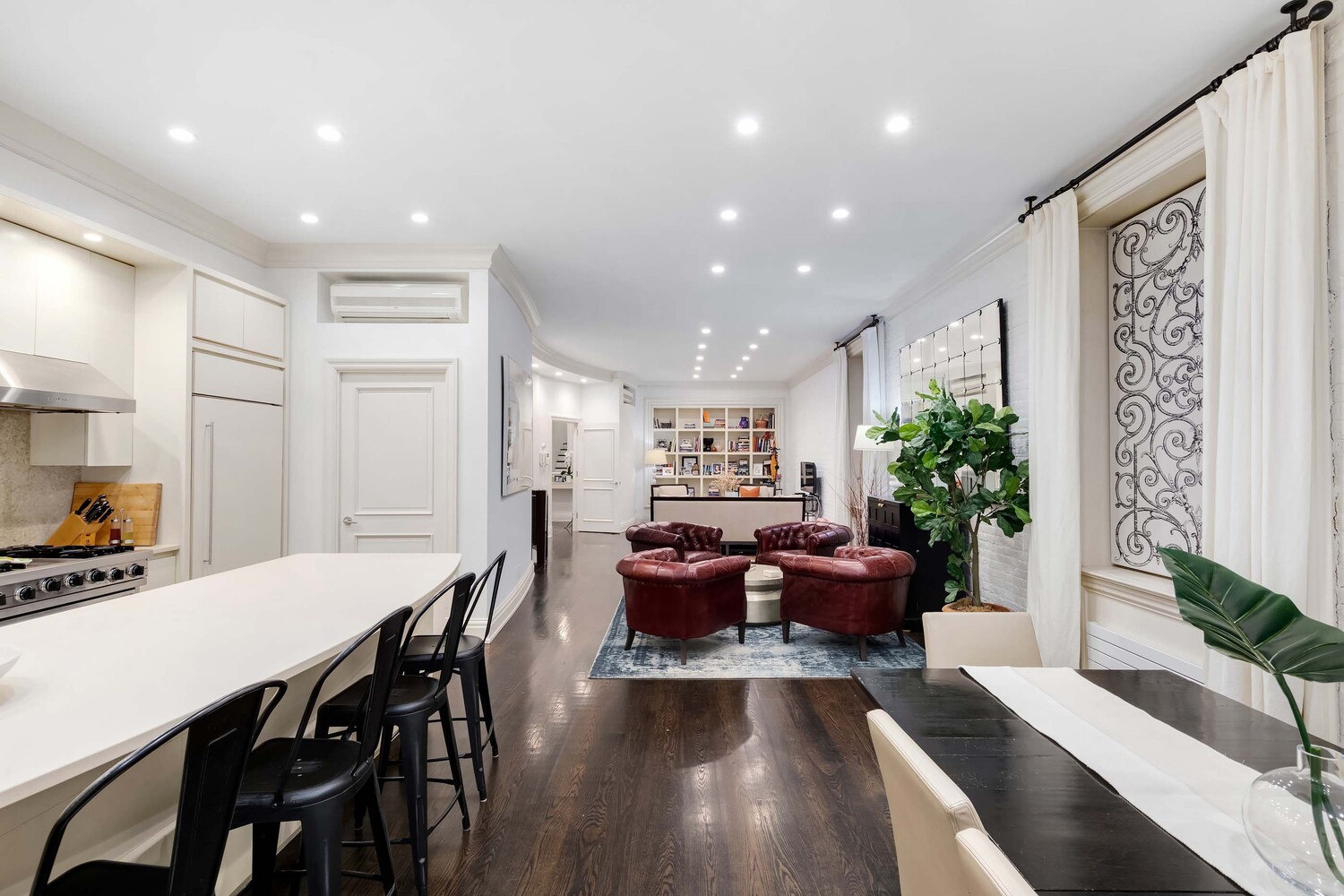 Impeccably renovated 3-floor condominium with the scope of a townhouse. This well-proportioned 3,234 sqft. 3 3-bedroom 3-bath home is located on the crossroads of West Village, Soho, and Tribeca. Enter into the large open 48' long living space with exposed brick, built-in bookshelves, beautiful mouldings, maple mahogany stained floors, recessed lighting throughout, and central air. The custom open kitchen features Sub-Zero, Viking, and Bosch appliances with an enormous island, Silestone counters, and limestone mosaic backsplash. A separate dining area and powder room are also located on this floor. Upstairs are 3 bedrooms, 2 baths, and a washer/dryer. The master suite has a windowed bath with a double sink, a steam shower, and limestone floors. What sets this home apart is the huge rec room downstairs, perfect for a kid's playroom, gym, home theater, or whatever suits your needs-located near transportation and a stone's throw away from the Hudson River Park.