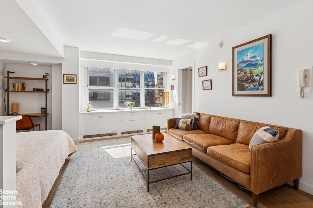Sun-filled corner studio with sweeping south and west city views-ideal for watching the sunset. Thoughtfully redesigned and fully renovated, this residence features a windowed open kitchen with dining bar, a spa-like windowed bathroom with marble finishes, soaking tub, and premium fixtures, plus abundant storage. The living area is enhanced by French Oak floors throughout, custom built-ins, a walk-in closet, and a utility closet.