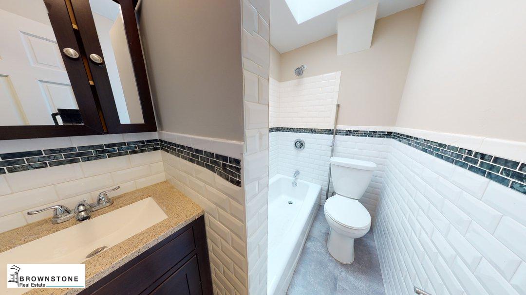 The renovated bathroom has a skylight, and a second skylight in the living room makes this apartment a sunny and cozy oasis.
