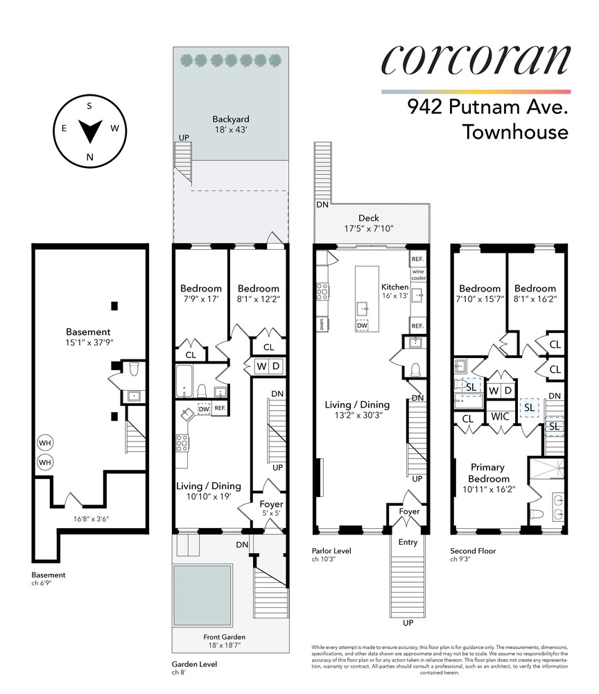The 45-foot parlor floor stretches from a gracious living and dining area with a decorative fireplace straight into a kitchen that anchors the entire home. Wrapped in custom ashy walnut cabinetry and elegant Calacatta marble, the kitchen is as functional as it is beautiful, with Thermador double wall ovens, an integrated dishwasher, and full-height separate Fisher & Paykel refrigerator and freezer framing a perfect wet bar. A discreet pantry adds storage and utility, while oversized sliding glass doors extend the space onto a South-facing deck overlooking the backyard. Even the powder room makes a statement with bold wallpaper.
