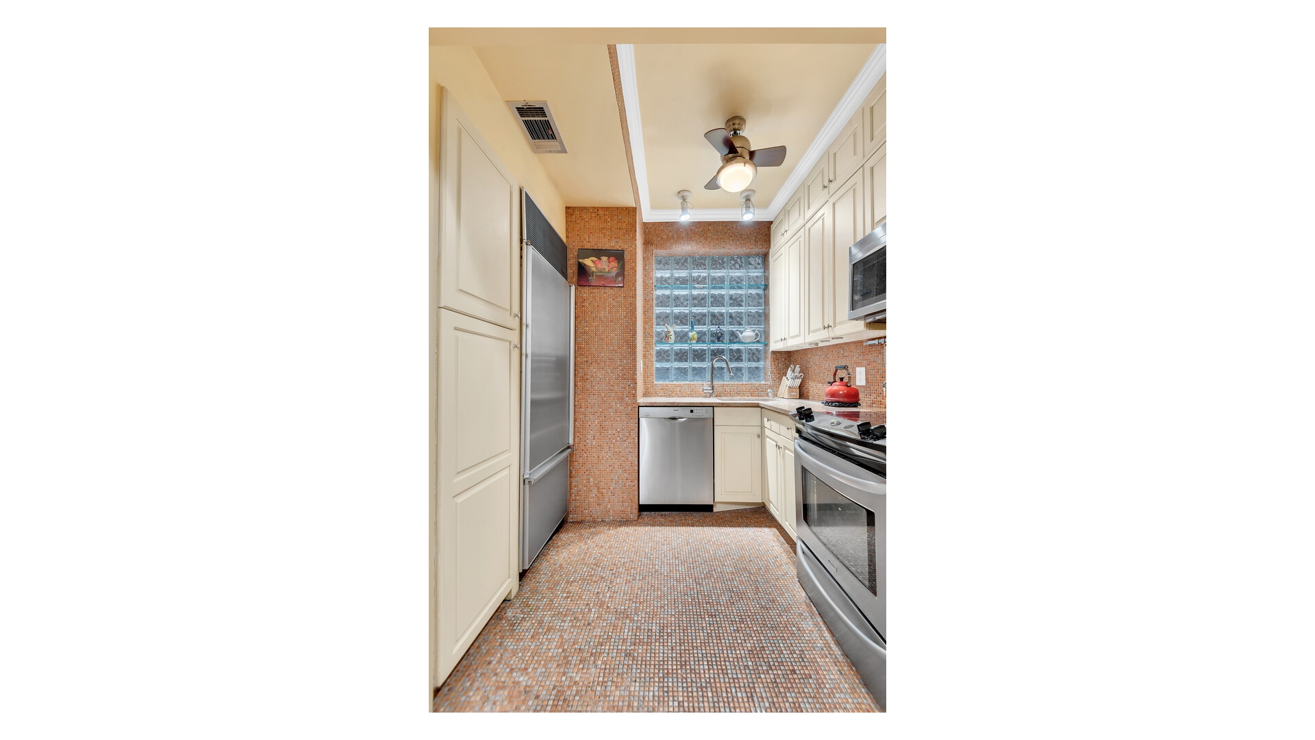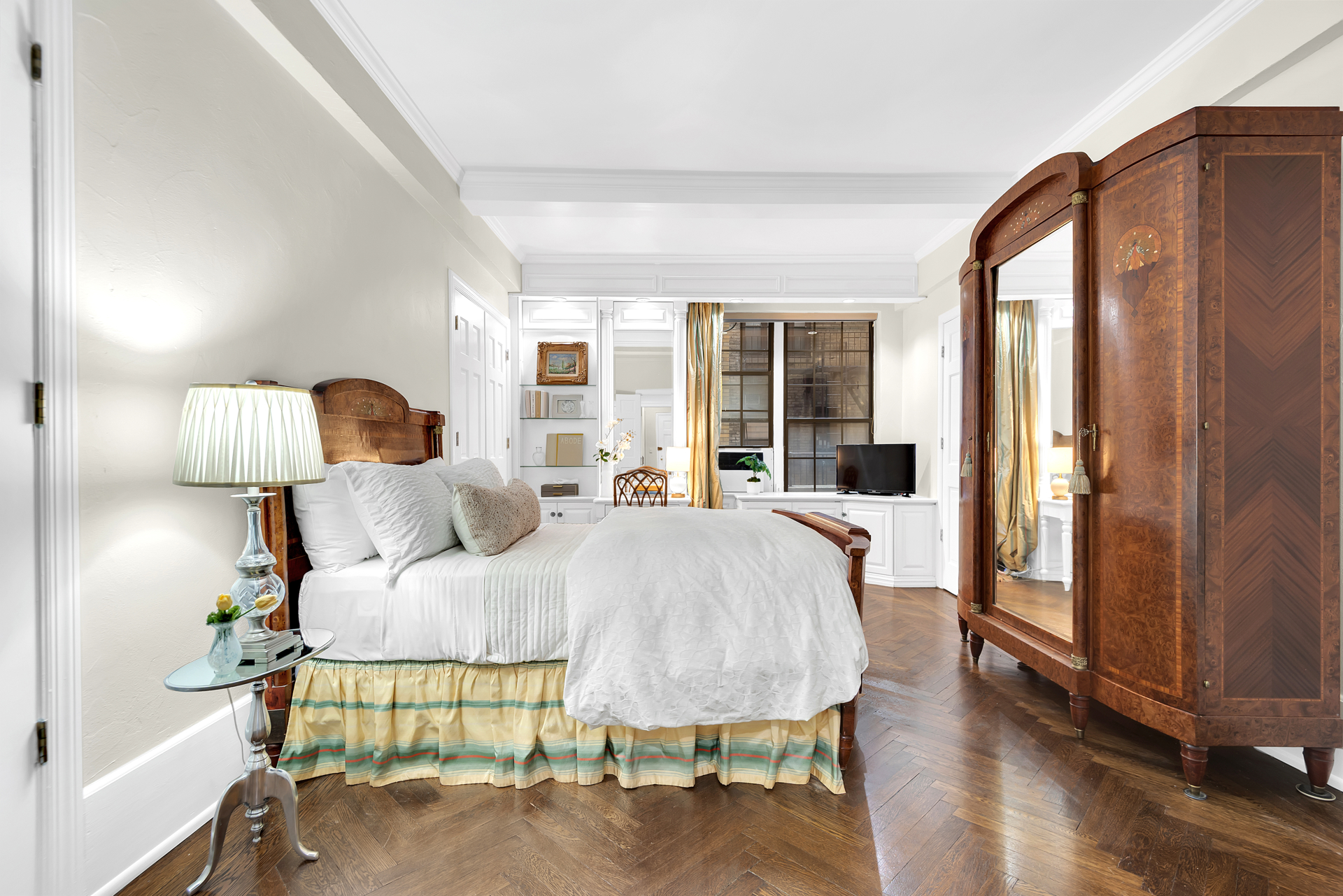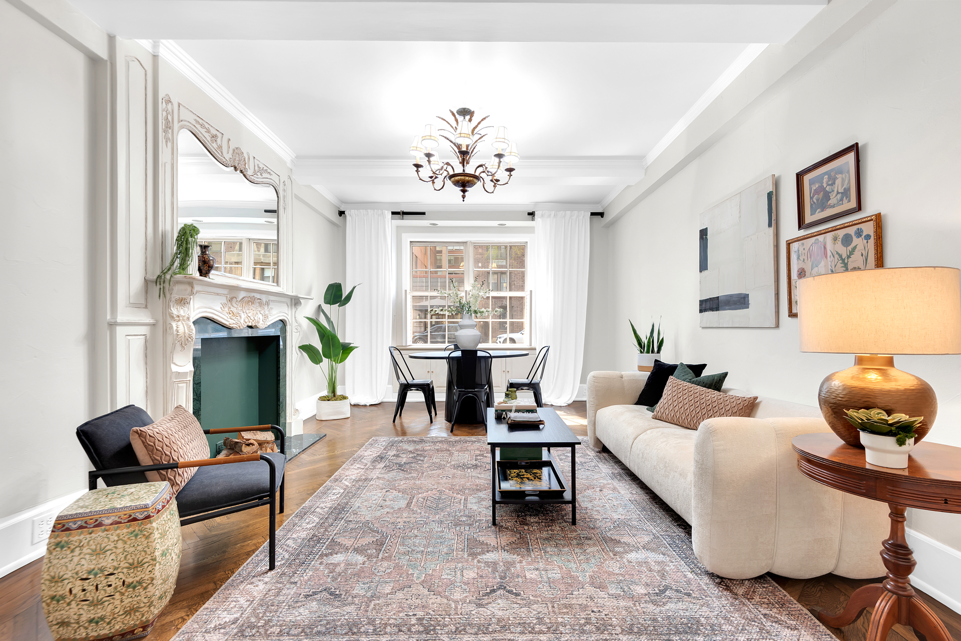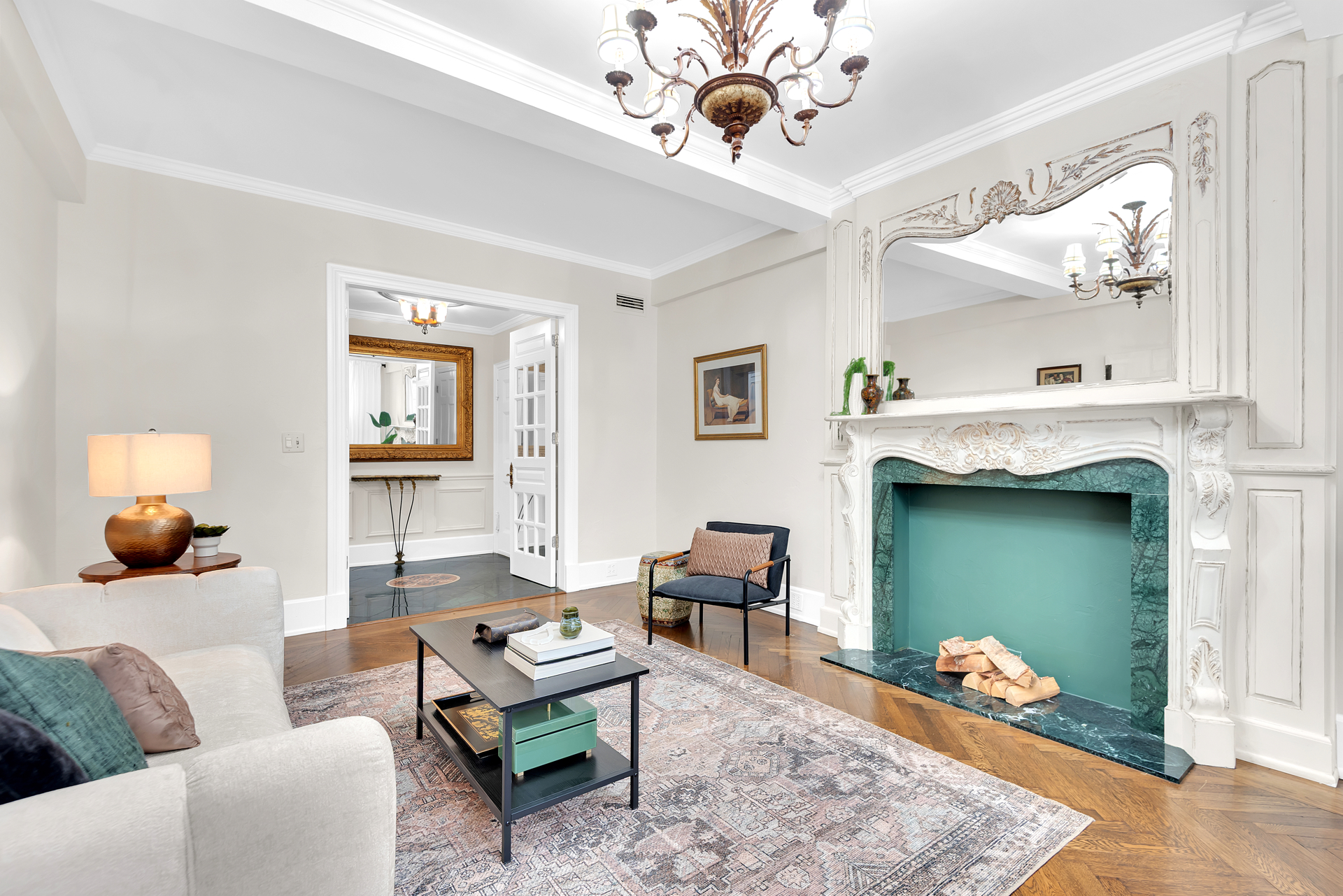 Never wait for the elevator again, just enter through the elegant marble lobby right into your fabulous new home! With great scale and flow, this one bedroom, two bath home is ideal for gracious living and entertaining. Prewar features include high beamed ceilings, beautiful herringbone oak floors and a fabulous decorative fireplace. The peaceful bedroom has great storage space (including built-in storage and desk area) and easily accommodates a king sized bed and oversized furniture. The opulent en suite bath features luxury Sherle Wagner fixtures, an oversized spa tub and marble galore. The second bathroom is similarly fitted and includes a corner shower for those pesky overnight guests. The separate kitchen has tons of cabinet space, stainless appliances, stone countertops and a glass block window and mosaic tile floors and backsplash provide a whimsical midcentury modern touch. The large foyer with abundant built-in storage serves as an ideal dining space. Central air, too! On top of that, you will enjoy easy access to the building's common garden down the hall, which is nicely landscaped and furnished with lounges and BBQs for your relaxation.