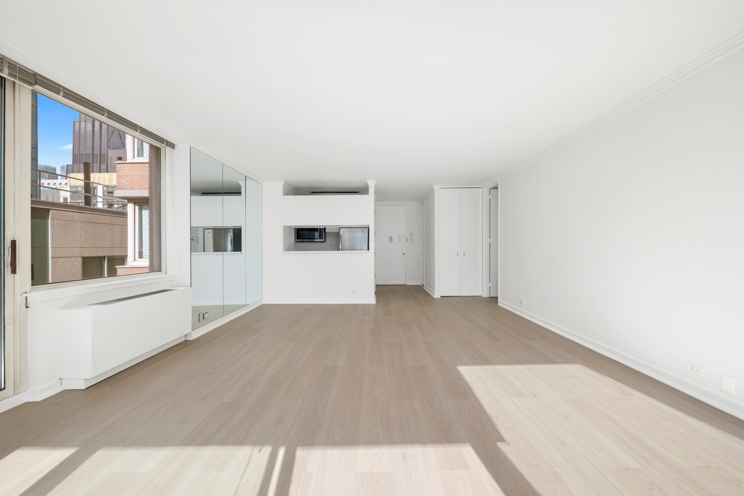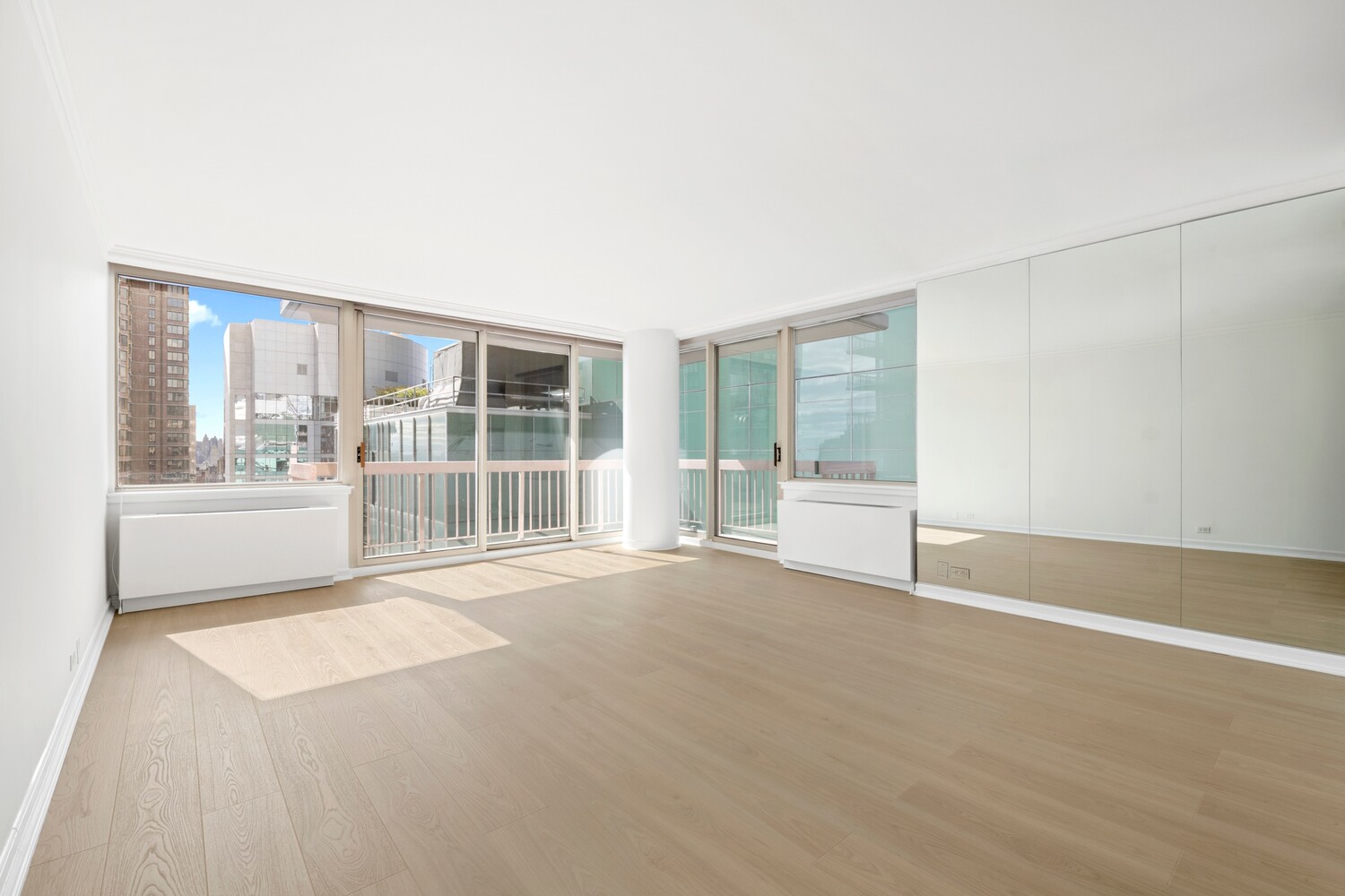 Awash in south light and offering gorgeous city views , this 37th floor 1 Bed/1.5 Bath features a gracious entrance foyer preceding a south-west corner exposure living room with floor-to-ceiling windows and a private wrap balcony accessed by a pair of sliding glass doors. The sun-filled living room is beautifully proportioned at approx. 16.5 feet wide by over 20 feet in length with a spacious dining area and an area for a home office.