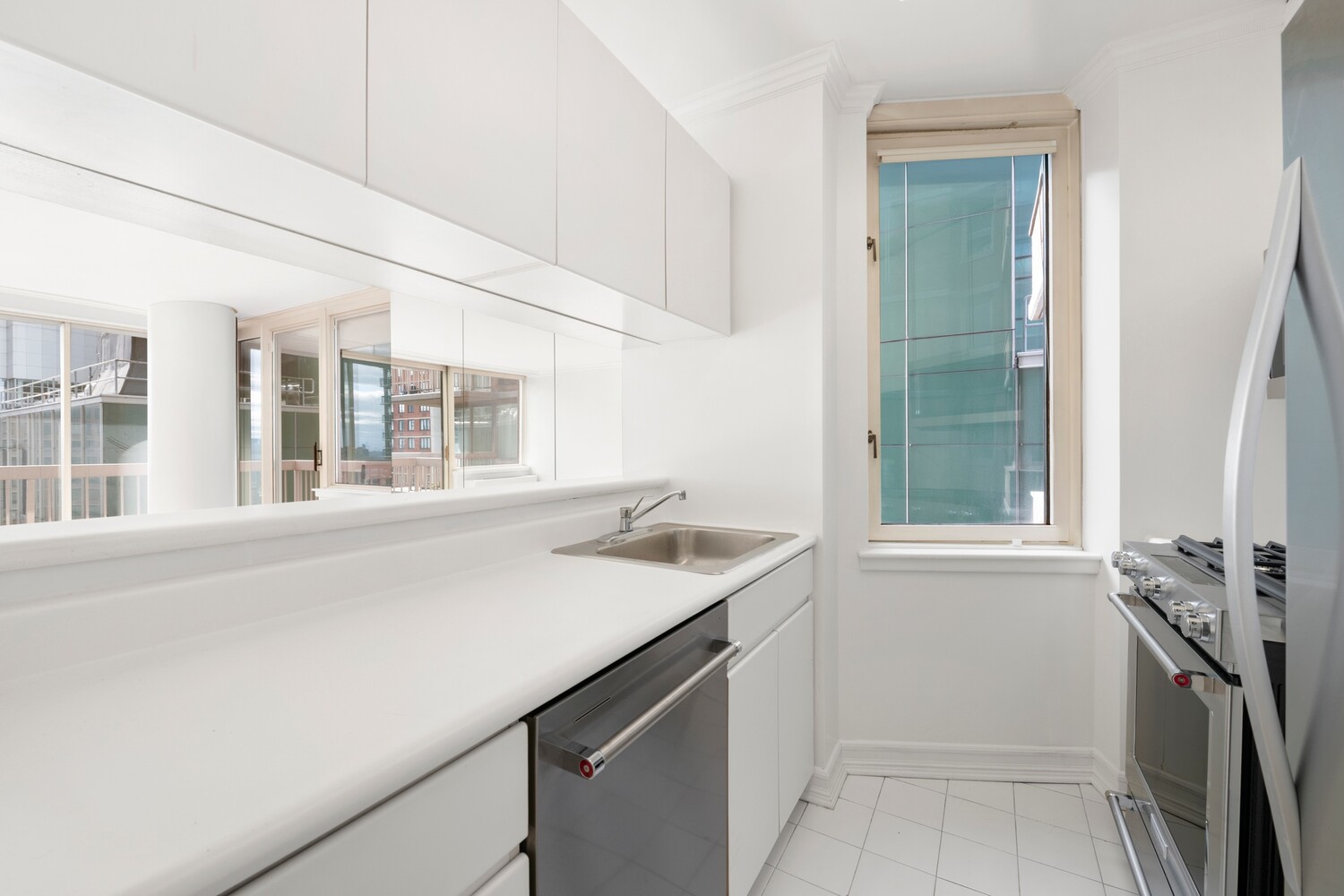 The spacious windowed kitchen with white cabinetry has brand-new stainless-steel KitchenAid appliances, a large pass thru to the living room, excellent countertop workspace and superb storage. It's ideal for those who like to cook and entertain .