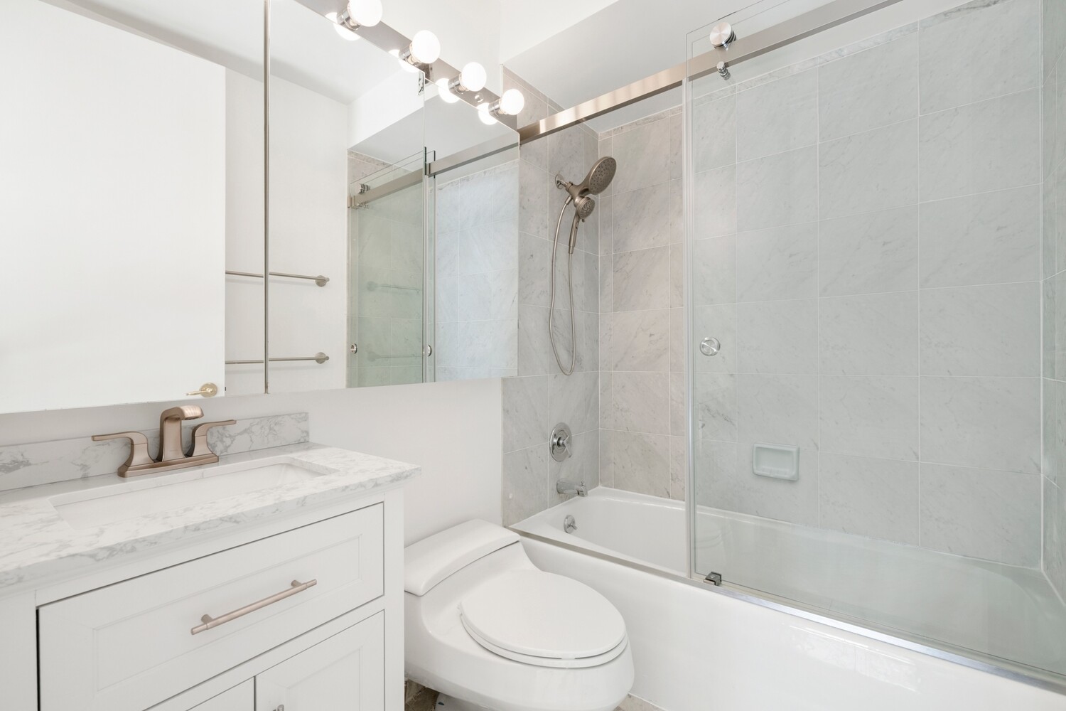 The extra-large south-facing bedroom easily accommodates a king-sized bed, features an en-suite Carrara marble bath with a new marble-top vanity, new frameless glass shower doors and an oversized closet.