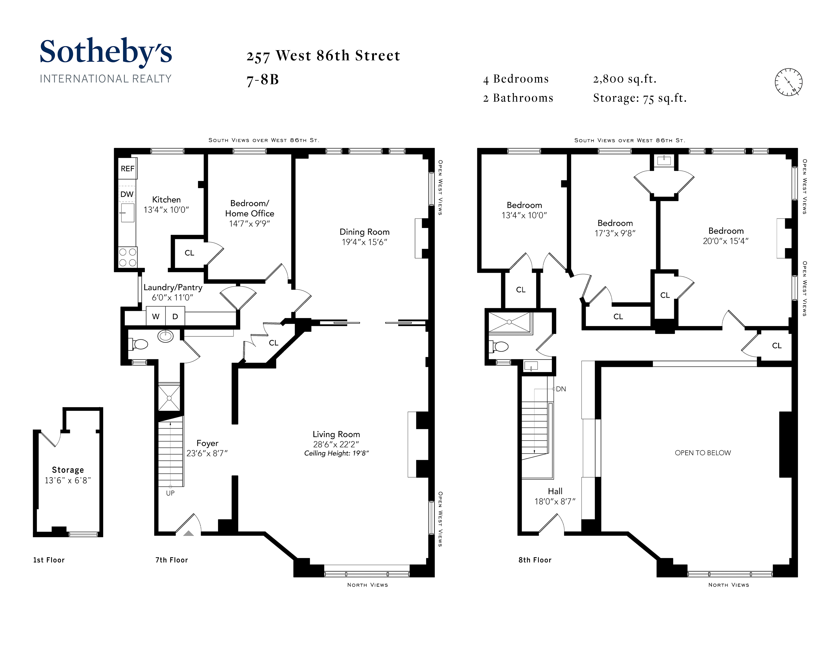 • Offered for the first time in half a century, Residence 7/8B is one of the rare B-line southwest-corner duplexes at 257 West 86th Street. Spanning nearly 2,800 square feet, this legacy home combines dramatic scale, preserved craftsmanship, and three luminous exposures—a unique opportunity for a discerning buyer to create a landmark-quality residence on the Upper West Side. The centerpiece is a double-height living room crowned by a 20-foot ceiling and anchored by a 14-foot window that bathes the interior in even north light. The window’s nine etched-glass panes are currently being replaced with new ultra-clear low-lead glass. Overlooking the living room are a pair of original galleries with wood balustrades, carved in the cross-braced lattice motif that recurs throughout the building. The formal dining room, kitchen, and bedrooms face West 86th Street to the south and the neighboring church to the west. The home is currently configured as three to four bedrooms with a formal dining room and two full bathrooms; the building’s duplexes typically support three-bathroom layouts. Private laundry is located off the kitchen, and new washer/dryer installations are permitted. Adding further versatility, the sale includes a private, windowed room on the building’s ground floor—originally a staff room located just off the lobby—now perfectly suited as a secure personal archive or family collection space. 257 West 86th Street is a boutique cooperative, designed in 1906–07 by Pollard & Steinam, architects of the Hotel des Artistes and other landmark studio residences. At 257, they blended Beaux-Arts scale with Arts & Crafts detailing: soaring double-height living rooms framed by classical entablature and simplified, geometric ornament—a fusion unique to the pre-WWI era in New York architecture. The building offers a 24/7 lobby attendant/elevator operator, new gym, landscaped roof deck, basement laundry, deeded storage for every unit, bike storage, and a full-time resident manager. This is a rare chance to create a lasting pre-war home with scale, light, and architectural character, at an attractively compelling value.