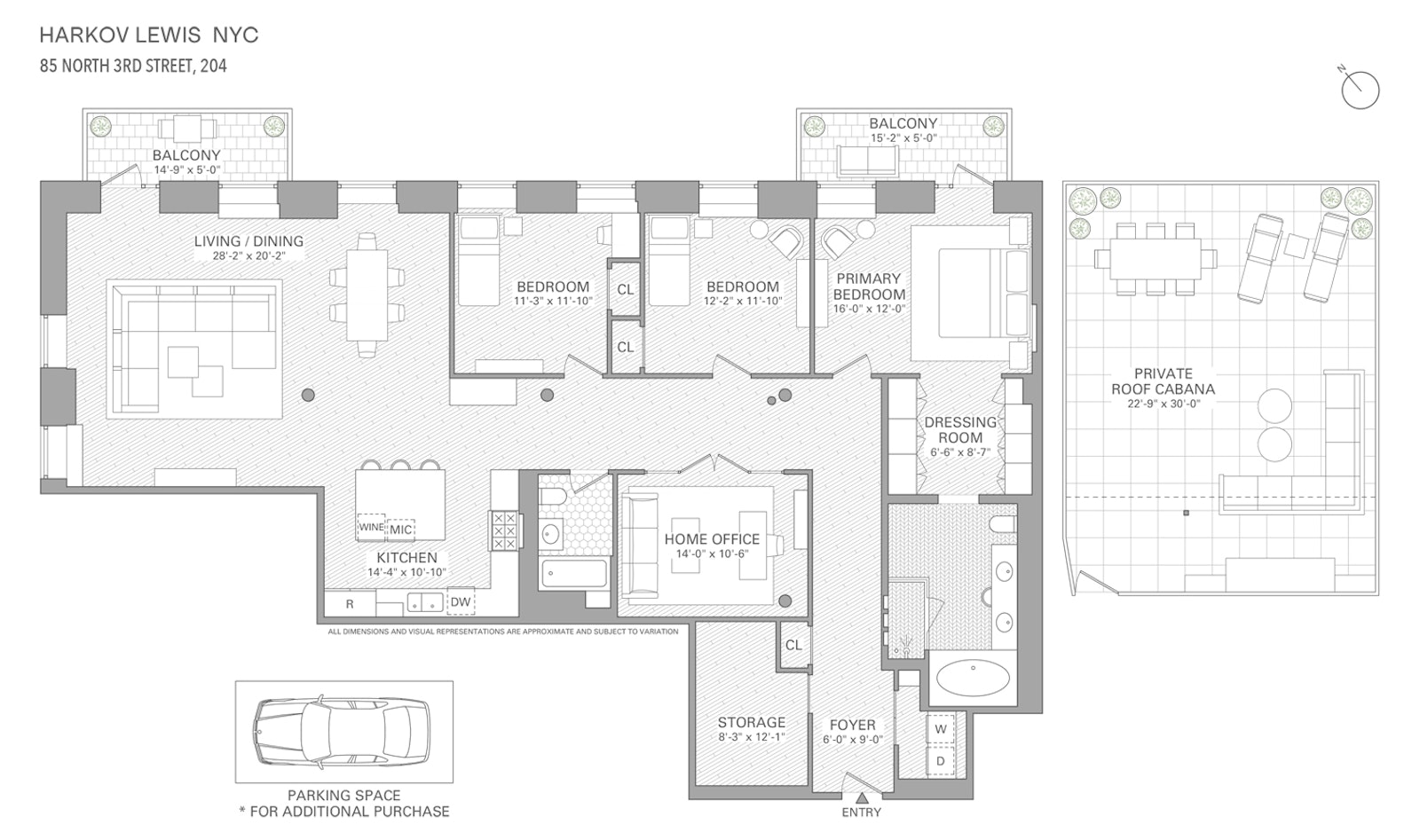 A formal entry gallery opens to a sweeping entertaining space spanning the northwest corner of the building, where a great room offers scale for multiple living and dining areas. The open chef's kitchen with center island is ideal for gatherings. The primary suite is a private retreat, featuring a sun-filled bedroom, custom dressing room, and an oversized spa bath with double vanity, soaking tub, and glass-enclosed shower. Two additional bedrooms, a home office or interior bedroom, a full secondary bath, and dedicated laundry with utility room complete the thoughtful layout. Private outdoor space includes balconies off the living room and primary suite, as well as a 600+ SF rooftop cabana with panoramic views of the East River and Manhattan skyline.
