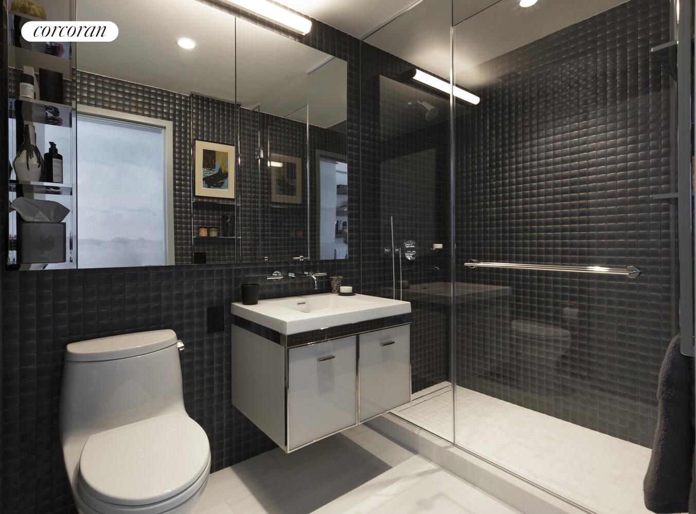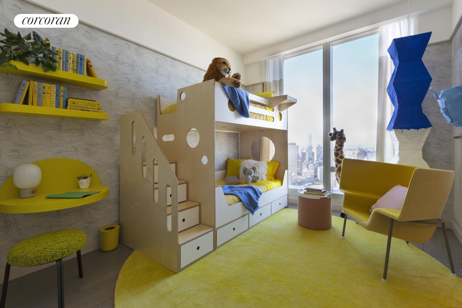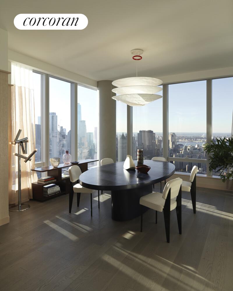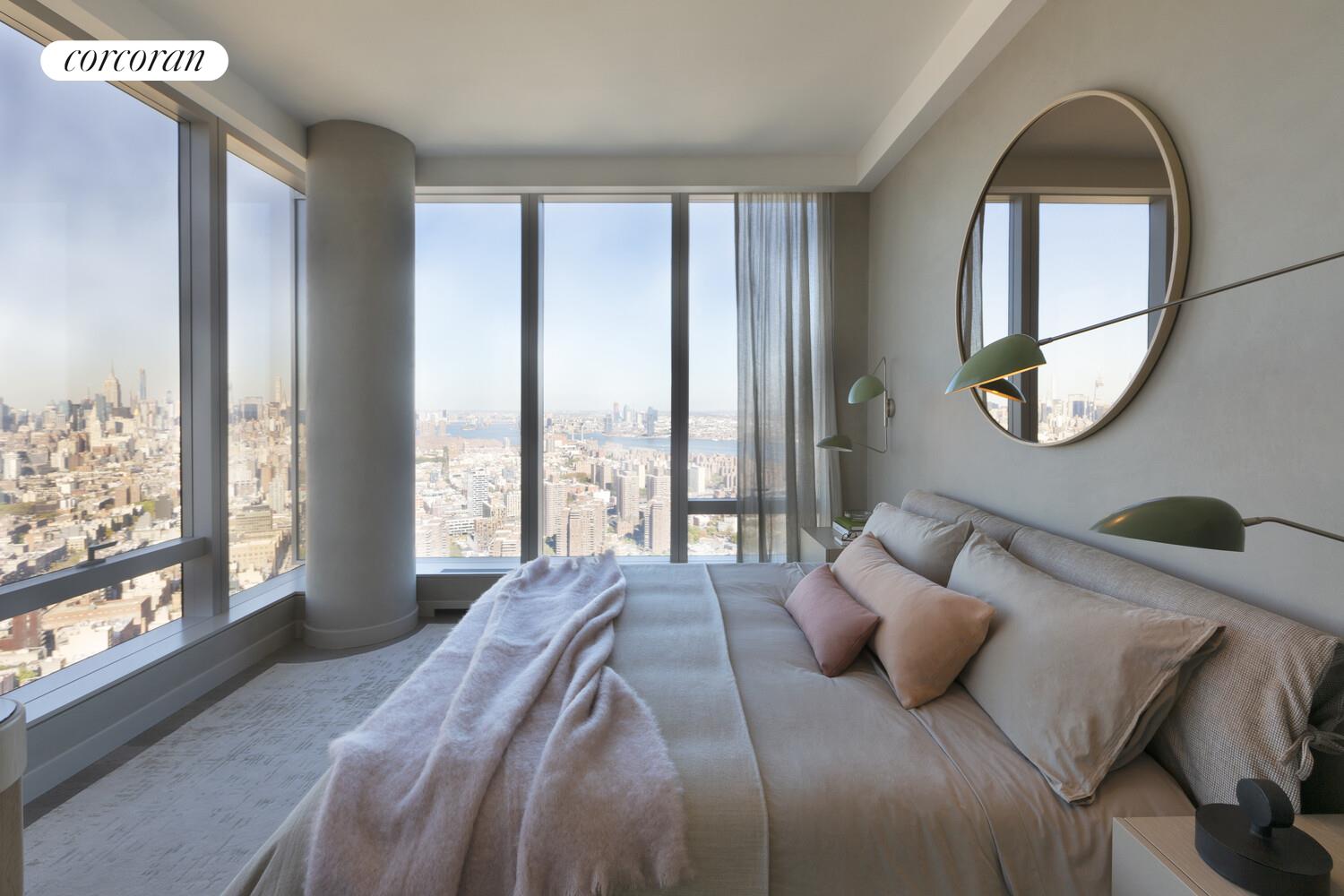The Skyscape Collection, featuring Residence 77J, is a home in the sky. This generous 2,347 square foot triple exposure 3 bedroom, 3.5 bath residence is designed by Meyer Davis and features 270 degree views of the Lower East Waterfront, New York Harbor, Financial District and Midtown Manhattan. Astonishing panoramic views from South West and North West corner living room and dining room. Windowed gourmet kitchen with a breakfast bar, pantry closet, premium Miele and Subzero appliance package with a double oven plus speed oven, built-in whole-bean coffee system, integrated refrigerator, wine fridge, dishwasher and externally fully vented kitchen hood. Corner Master Bedroom suite with side-by-side walk-in closets, luxuriously appointed windowed 5 fixture ensuite bath with a steam shower, Wetstyle soaking bathtub with custom stone surround, radiant floor heating and a separate water closet. The second and third bedrooms are thoughtfully appointed with en-suite baths with imported stone and custom finishes. This residence comes equipped with a side-by-side, fully vented washer and dryer. A gorgeous powder room with a Boffi pedestal sink and Covelano marble polished stone accent wall and floors completes this magnificent home.