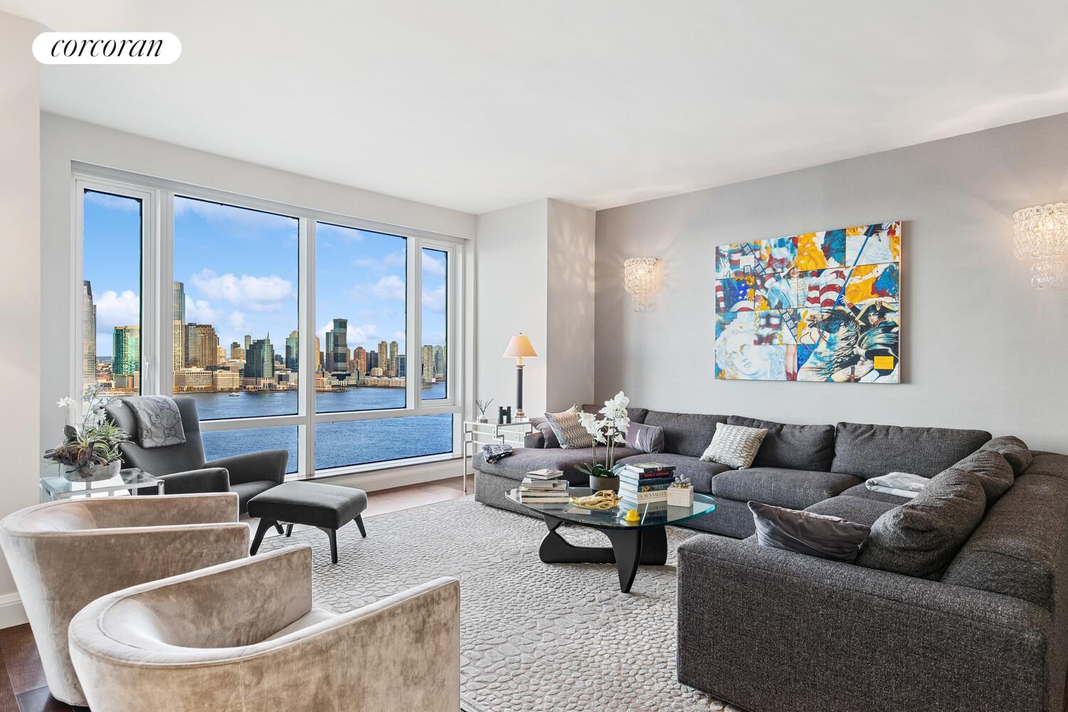 Be prepared to be wowed by the direct water views throughout from the floor to ceiling windows of this gorgeous, high floor, home at the luxurious Visionaire Condominium. Upon entering this turnkey, 2 bedroom/2 bath plus den residence, which is currently configured as a grand one bed plus den, you are greeted by an open chef's kitchen with top-of-the-line appliances including Sub-Zero refrigerator, Wolf oven, food disposal, tile back splash, quartz countertop, ample sleek gray cabinets and breakfast bar. Opposite the kitchen is a large home office/den with walk-in closet which could be used as an additional living space. Meander into the 30 ft wide great room and enjoy the boats and sunsets from the 10 oversized windows. At 18 feet in length, the very private primary bedroom can easily accommodate a king sized bed, two end tables as well as an office or seating area all while enjoying the extensive water views. Rounding out the primary bedroom suite is a 5 piece limestone bathroom and three closets, one of which is a walk in. Other features of this extraordinary home are wood floors and motorized blinds throughout, sconce lighting and an in unit washer/dryer.