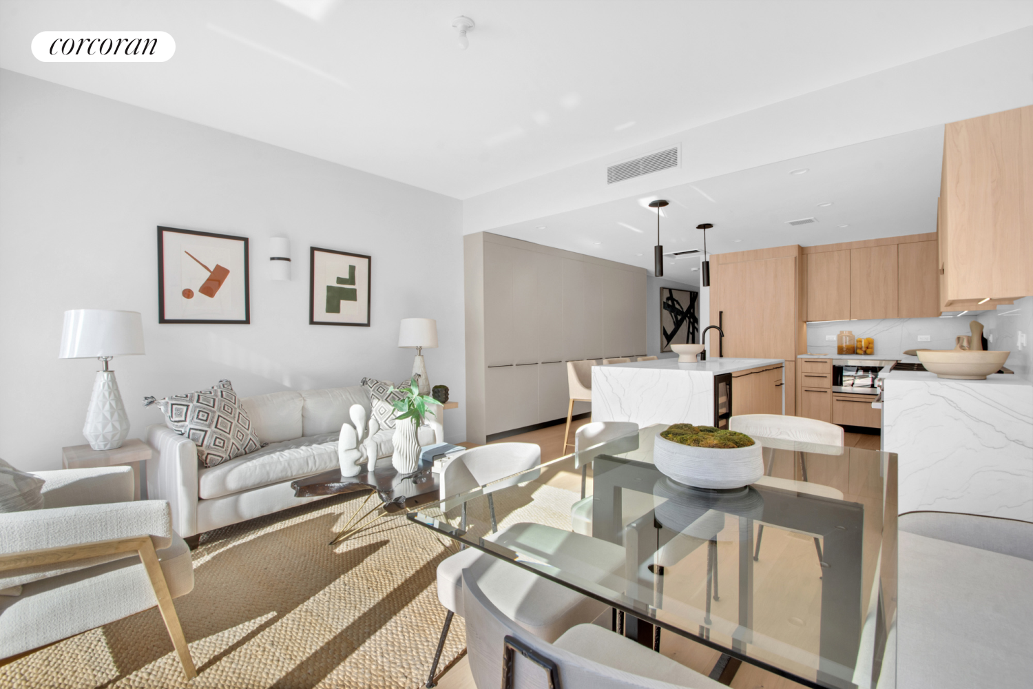 Upon entry, you're welcomed by a bright and airy entertaining level, with high ceilings, crisp plank PID white oak flooring, and oversized windows that let in a plethora of natural light. The chef's kitchen is a masterful blend of style and functionality, outfitted with fully integrated and paneled Miele appliances, six-burner gas range, including a wine fridge, vented hood, microwave & disposal. Custom Porcelanosa cabinetry, pantry, matte black Kohler fixtures, and a striking granite waterfall island with a matching single-slab backsplash that elevate the space. Flow seamlessly from the kitchen and dining area into the home's expansive private garden, a serene retreat with 30 feet of depth-ideal for al fresco dining and entertaining.