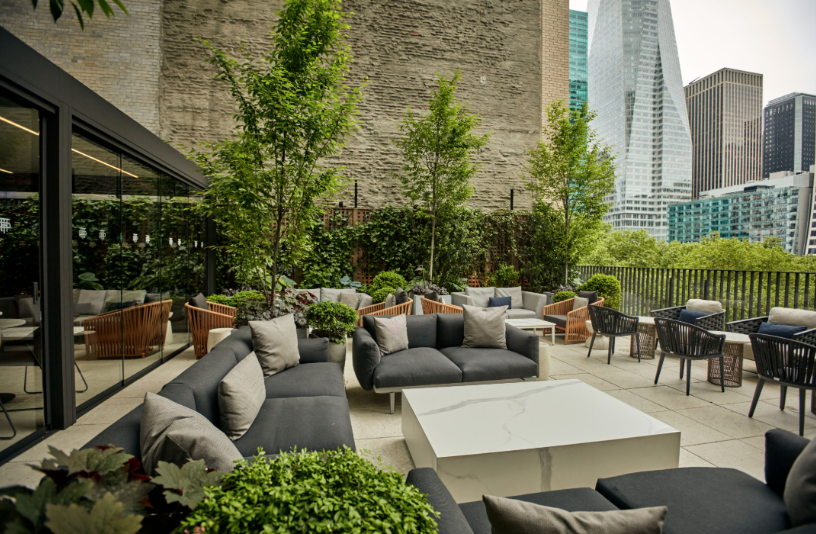 Residences at The Bryant, located at 16 West 40th Street, sit atop a boutique hotel and amenities include a 24-hour attended lobby, lounge, fitness center with sauna, and access to the Branch Club with fireplace and full bar overlooking Bryant Park.