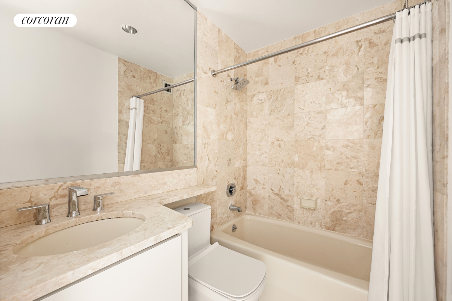 On the opposite end of apartment is the equally spacious second bedroom with a northern exposure, complete with its own en suite marble bathroom and large closet.