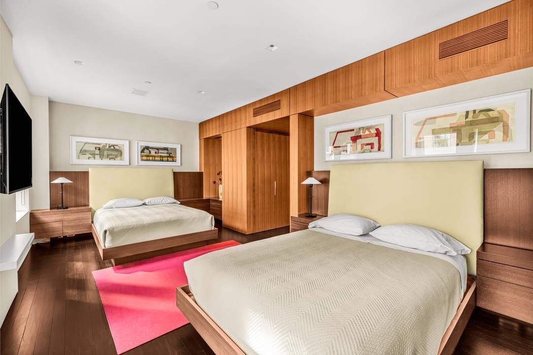 The open-concept kitchen is a culinary artist's dream, graced with high-end stainless steel appliances, including a Subzero double-door fridge, Subzero wine refrigerator, Bosch double oven, Gaggenau stovetop, and Miele built-in Nespresso maker. The stunning bespoke cabinetry speaks to the quality found throughout this home. On the North side of the apartment, there is also a chic wet bar which serves as the ultimate companion for sophisticated entertaining, ensuring that every gathering is a memorable affair. All four bedrooms have stunning interior views which look more like a scene from London’s Soho, and provide quiet solitude all day long. With low buildings surrounding these views, there is light throughout the day. In addition, two of the upper bedrooms have walk-in closets for all of the shopping that will inevitably be done while living in the neighborhood.