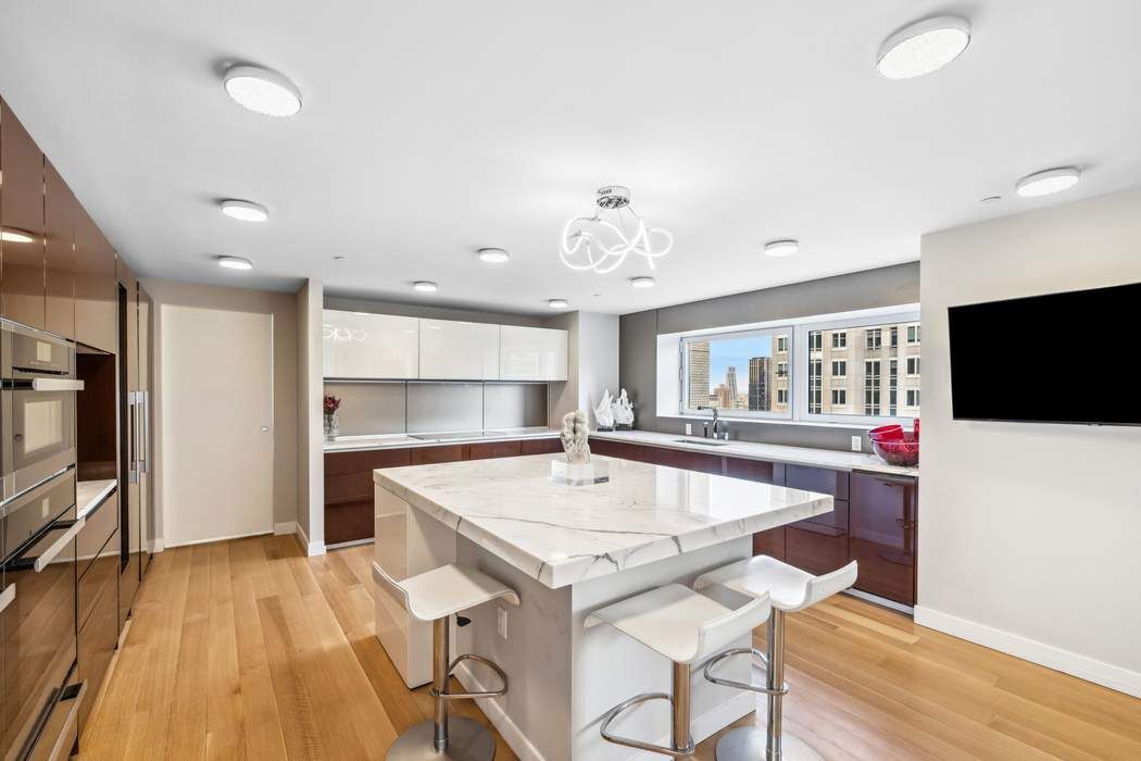 Upon arrival, your elevator opens into your private elevator landing, which flows into a tremendous double-height great room with soaring 18-foot ceilings and floor-to-ceiling glass walls, allowing natural light to pour in from sweeping southern and western exposures. The open-concept layout flows effortlessly into a formal dining area and a masterfully designed chef's kitchen featuring top-of-the-line Miele appliances and exquisite Calacatta marble countertops.