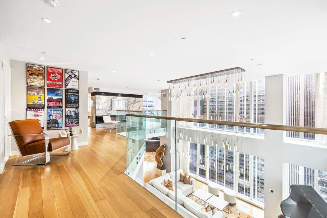 The upper level of this extraordinary penthouse can be accessed via a private elevator or by the breathtaking triple-height glass staircase, an architectural masterpiece that serves as the residence's stunning focal point. A glass banister off the stairs overlooks the soaring double-height great room below, emphasizing the dramatic scale of the home. This level is thoughtfully divided by a striking double-sided stone fireplace, seamlessly separating the east and west wings. The east wing is dedicated to the primary suite, a serene private retreat featuring triple exposures, a private east-facing terrace, and a spacious dressing room. The spa-like en-suite bathroom is adorned with a freestanding soaking tub, an oversized two-sided pass-through shower, and dual vanities, all exquisitely finished to the highest standards. The west wing encompasses two generously sized bedrooms with en-suite bathrooms and an office boasting northern city views. Completing the floor is an elegant living room anchored by a wet bar and an adjoining powder room, making it a perfect setting for relaxation and refined entertaining.