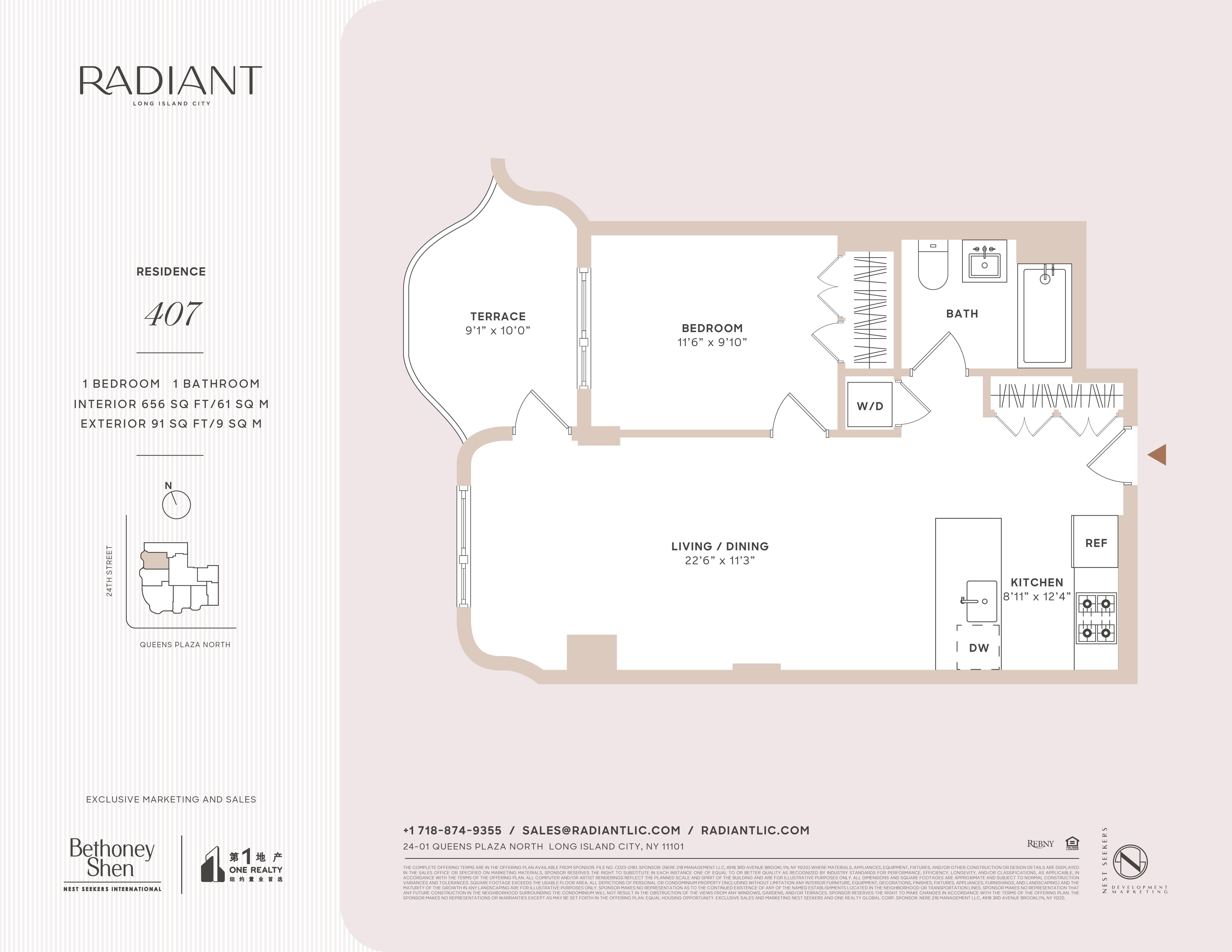 Welcome to this brand new 1-bedroom, 1-bathroom home at Radiant, a striking new luxury condominium and one of the most architecturally significant buildings to come to Long Island City. Residents enjoy elegantly designed and expertly crafted interiors that are airy, refined, and bright. The home begins with an open-concept living room, dining room, and kitchen with gorgeous hardwood floors and oversized windows with west exposure. The kitchen embodies contemporary design, blending soothing organic tones and high-end finishes without sacrificing functionality. Features include custom wood-paneled cabinetry, stylish marble countertops, a chic square tile backsplash, and fully-integrated Bosch appliances. The bedroom has a large reach-in closet and easy access to a pristine full bathroom adorned with patterned floor tiles, a custom wood-paneled vanity, an oversized vanity mirror with integrated LED lighting, radiant heated floors, and a deep tub with rain and handheld showerheads. A stacked washer/dryer completes this bespoke home. Crafted by the award-winning architect and design teams of ODA and Paris Forino, Radiant rises 19 stories and features a textured, gently curving undulating fac¸ade interspersed with protruding terraces and setback windows. The building offers a wide selection of curated amenities for discerning lifestyle preferences. Health and wellness spaces include a tranquil Finnish sauna, basketball court, and sun-splashed fitness center with cardio and weight training equipment. There are several lounges with plush seating, including a spacious glass-enclosed rooftop club with a fully-equipped kitchen, co-working area, game room, and children’s playroom. Outdoor areas include a ping pong courtyard and a sublime rooftop terrace with a grilling station and incredible views of the Manhattan skyline. There are also karaoke/media, bicycle, and dog washing rooms to complete this exquisite collection of amenities. Situated in an emerging residential enclave in Long Island City, Radiant is moments from numerous restaurants, bars, cafes, and shops. MoMA PS1, Brooklyn Boulders, Queensbridge Park, Target, and Murray Playground are all a few blocks away. Accessible subway lines include the 7/E/R/N/W/M/F. Pets are allowed.