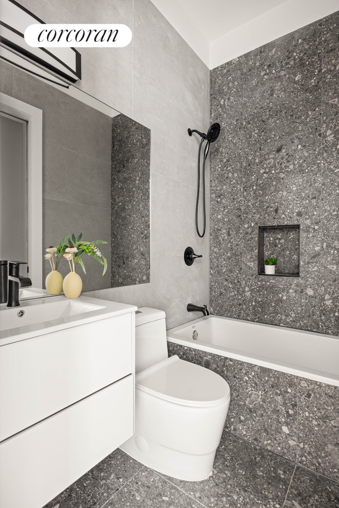 Making your way to the other side of the home, you'll find the first full bath, complete with a luxurious soaking tub, large-format tiling, and a stackable LG washer/dryer. Directly adjacent, you'll find another sizable bedroom with dramatic garden views and ample closet space.
