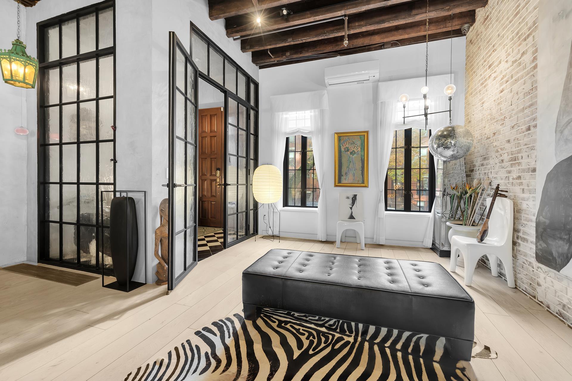 The primary point of entry is from the landing atop a classic NYC stoop, where you step into the foyer enclosed with steel and glass, offering a glimpse of the wide-open expansive space beyond, encompassing the entire second floor. From the foyer, proceed into the stunning living room, featuring gorgeous whitewashed exposed brick and the original exposed wood beams, with an open staircase wrapped in artistic custom iron railings. Ideal for comfortable living and fabulous entertaining, this 50-foot expansive space includes a fireplace, convenient wet bar, powder room, separate library and a wall of windows leading to the lovely terrace with steps down to the garden level (or take the elevator!)