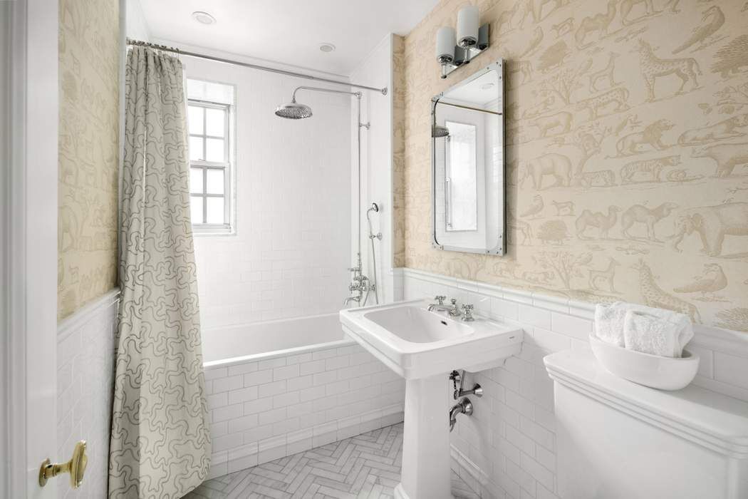 Upon entering, a gracious wallpapered foyer sets the tone, leading into a sun-filled, south-facing living room adorned with original pre-war details, custom built-ins, new paneling, and a wood-burning fireplace. The living room flows effortlessly into an expansive dining room with a built-in bar and two large south-facing windows. Ideal for both entertaining and everyday living.