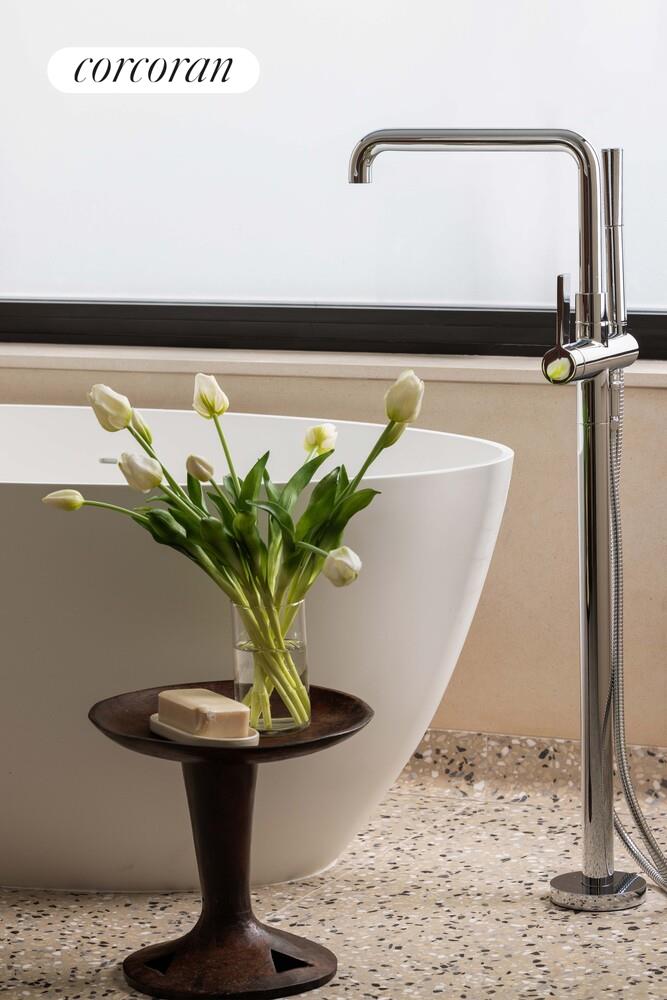 The primary bedroom suite includes a private, 157-sq/ft terrace and a millwork-lined dressing room offering a world of closet space, creating supreme privacy. Soaked in natural light, the 5-fixture primary bath features a freestanding tub, while the walls and floors of the bath are clad in limestone and terrazzo with natural airy tones.