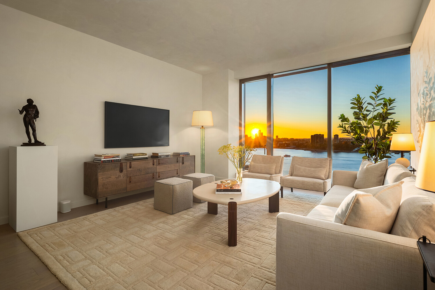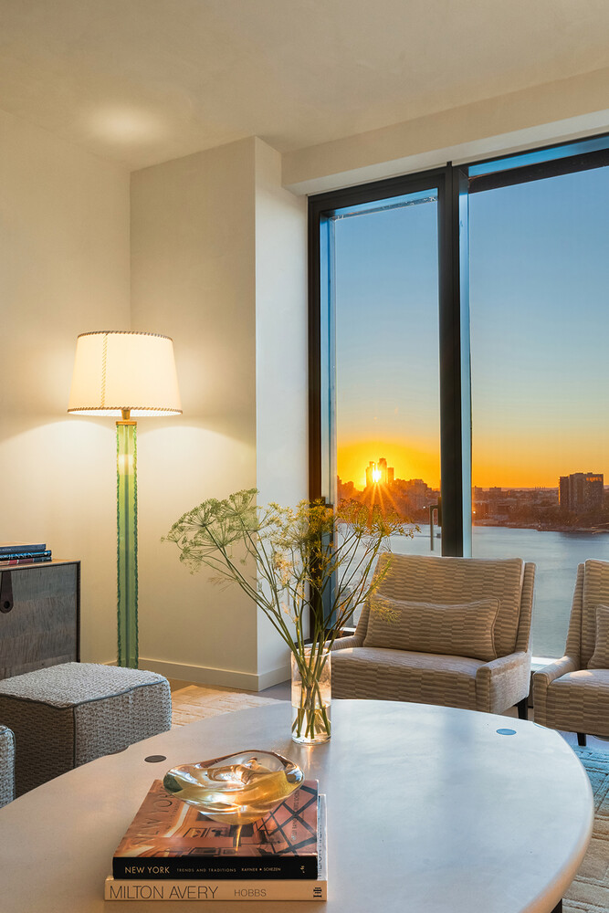 A private hall outfitted with closets leads to the primary suite, which is complete with floor-to-ceiling windows allowing natural light throughout the day. The bedroom also offers a view of the Hudson River. The elegant en-suite bath boasts Taj Mahal Quartzite, radiant heated floors, a custom Lumix vanity, and an integrated illuminated medicine cabinet.