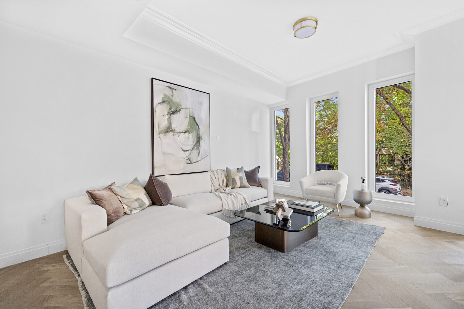 With interiors by Italian design firm S20M, the home begins with a gracious entry foyer and a spacious coat closet, unfolding into a striking living area where oversized, triple-glazed windows - including a distinctive curved corner - flood the space with light, while herringbone white oak floors set an elegant tone. The adjacent private terrace allows for true indoor / outdoor living.