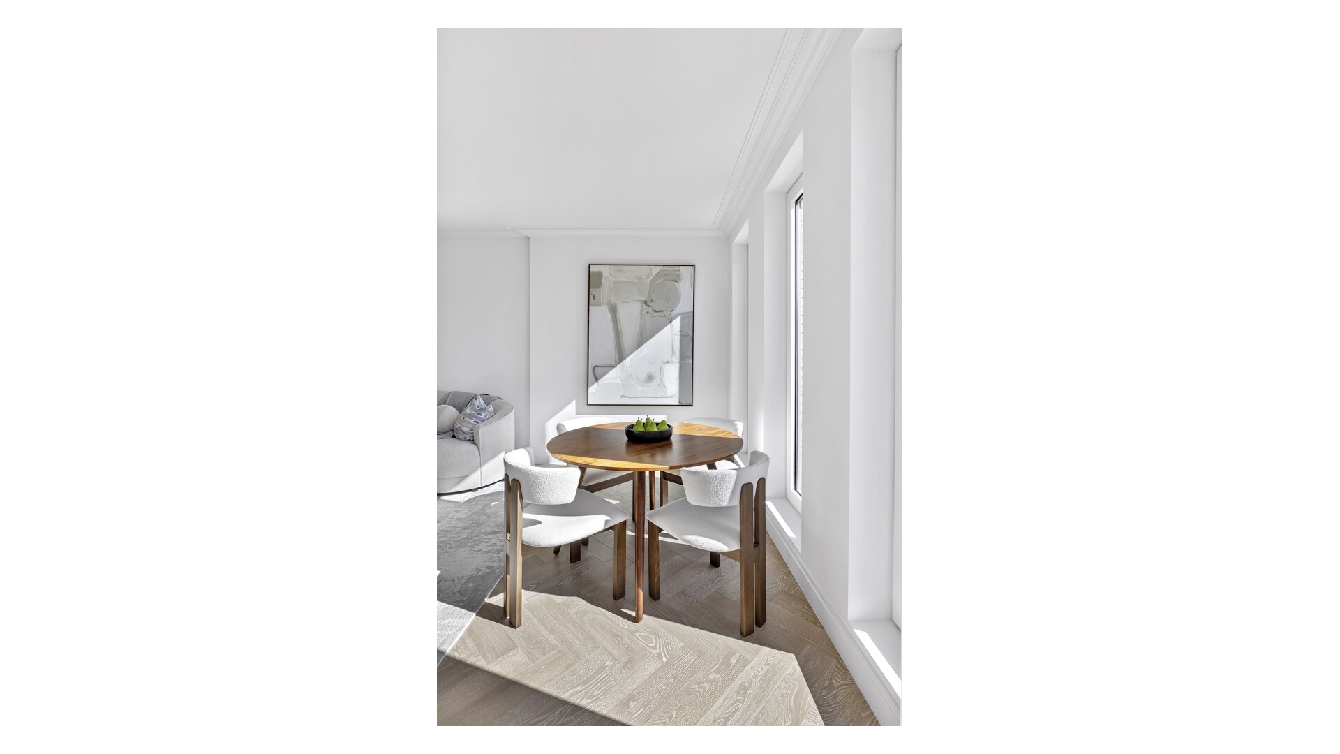 White Oak herringbone wood floors and spectacular custom wall paneling run throughout the primary living spaces, while the gracious living room is punctuated with floor-to-ceiling triple glazed windows. The adjacent private terrace allows for true indoor / outdoor living. The custom Scavolini kitchen features a best-in-class integrated suite of Viking appliances, including an induction cooktop with Savalo marble hood, refrigerator, dishwasher, and microwave. Glass upper cabinets with undermount lighting are paired with Italian Calacatta marble countertops.