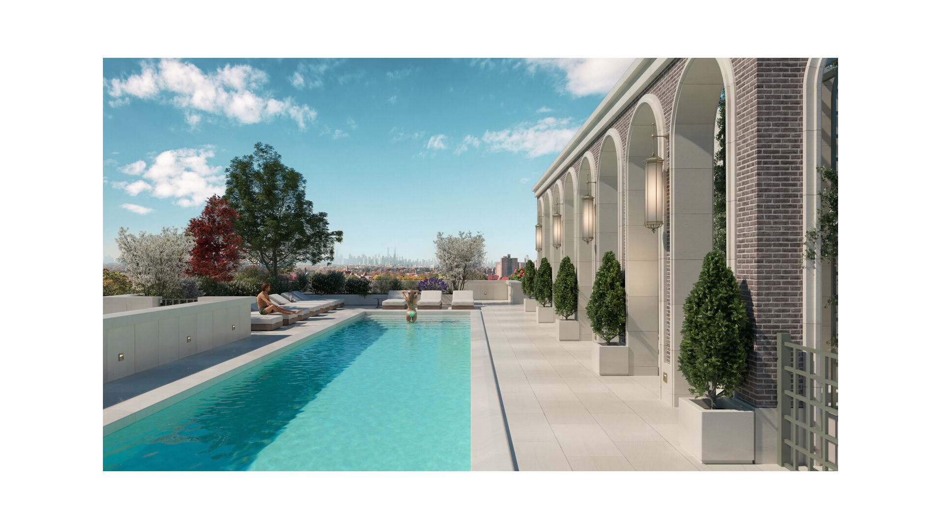 The Austin offers a refined collection of resort-style amenities designed to enhance everyday living. Residents are welcomed by a full-time doorman and concierge, with inviting spaces including a residents' lounge with garden views, a residents' library, and a vibrant children's playroom and music room. The state-of-the-art fitness center features cardio and strength equipment, a stretching studio, spa, and indoor basketball court. Two fully amenitized rooftop levels include an outdoor saltwater junior Olympic pool, pickleball court, outdoor cinema, and outdoor kitchen and dining areas with panoramic views of Manhattan and Queens. Additional conveniences include a live-in superintendent, pet spa, as well as private parking and private storage available for purchase.