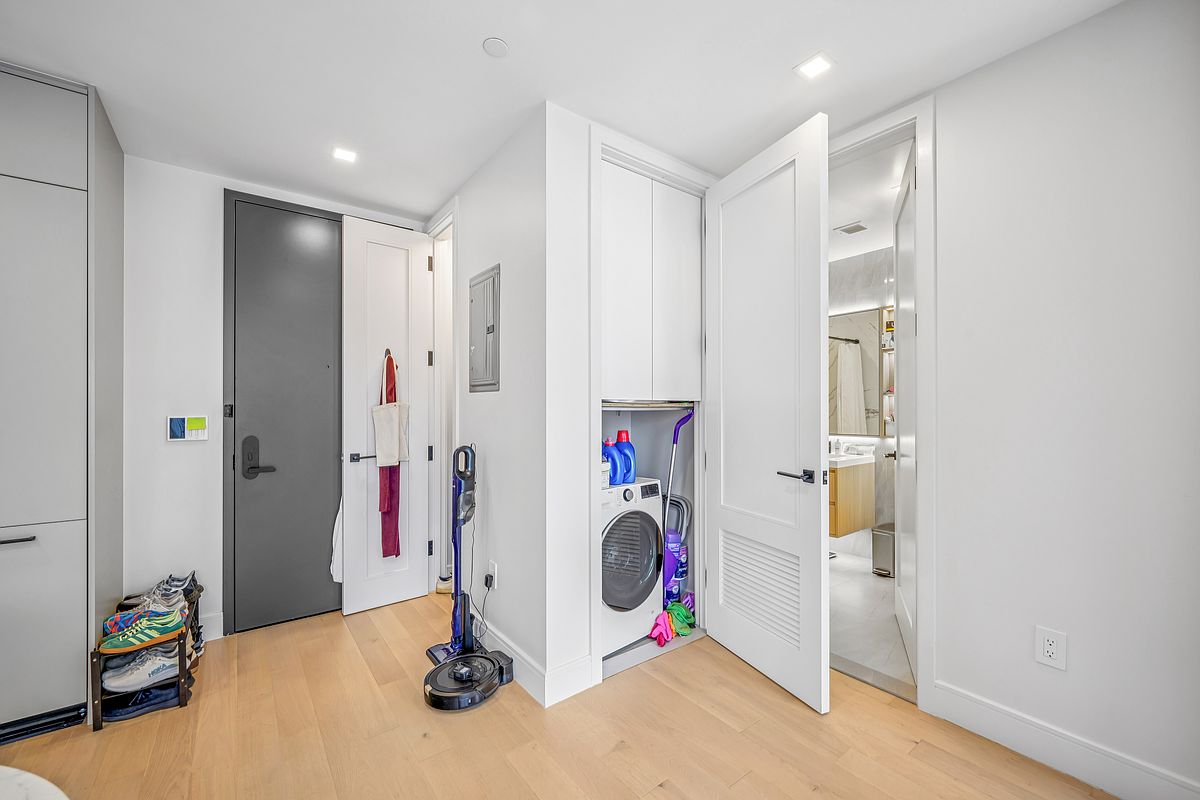 The open kitchen features sleek Bosch appliances, an induction cooktop with full exterior venting, and quartz countertops paired with matte black fixtures. High ceilings enhance the sense of space. The bedroom has a large reach-in closet and easy access to a spa-like full bathroom with porcelain tilework, Signature fixtures, radiant heated floors, custom shelving, floating vanity, and a premier Toto Neorest automatic toilet. Laundry is a breeze with an in-unit LG washer/dryer.