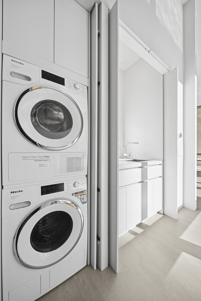 Additional conveniences include a laundry closet with Miele washer and dryer, a laundry sink with retractable cabinetry, a private in-unit refuse room, and Google Nest thermostats controlling the home's climate.